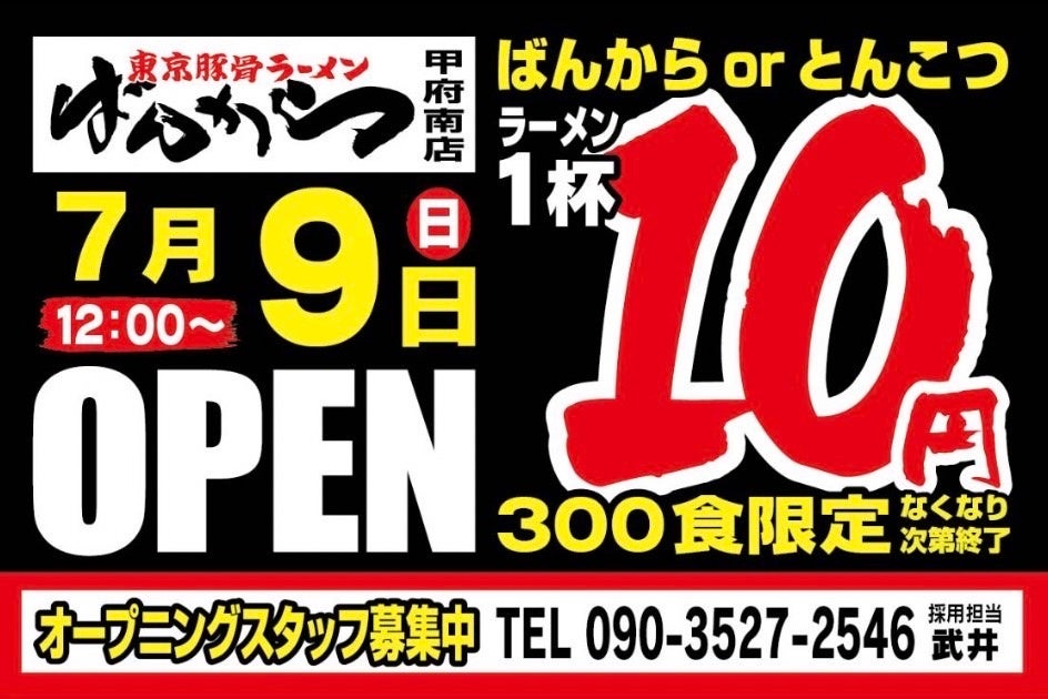 東京・池袋の老舗ラーメン店「東京豚骨拉麺ばんから 甲府南店」7月9日(日)山梨2店舗目として待望のオープン!【OPEN記念イベントを開催】