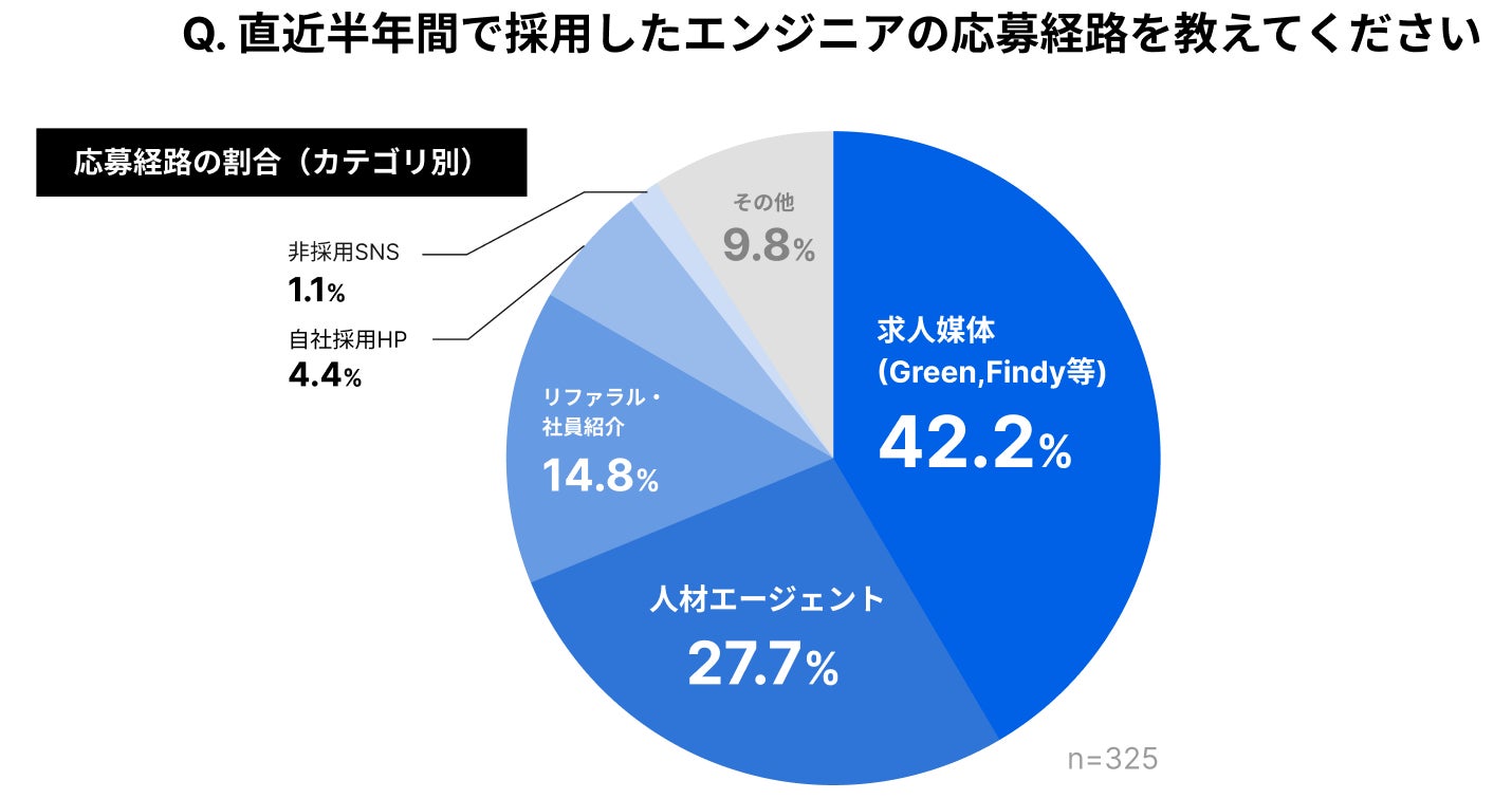 エンジニア採用全体の応募経路として最も多いのは「求人媒体(Green,Findy等)」で42.2%、次いで「人材エージェント」が27.7%、「リファラル・社員紹介」が14.8%という結果となりました。また、全体の約7割を有料の採用手段(人材エージェント、求人媒体)が占めることがわかりました。