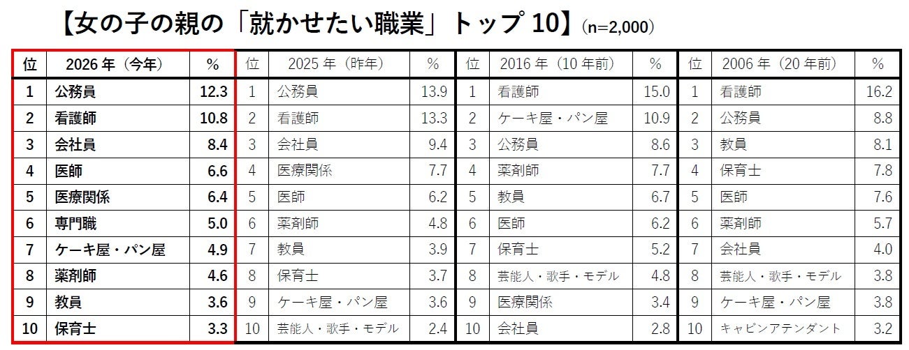 子どもの将来の安定を願う気持ちは毎年変わらず、今年も「公務員」が1位となりました。「会社員」は昨年よりポイントを落としたものの2位に定着。子どもの人気に連動して、「消防・レスキュー隊」は過去最高タイの4位となりました。一方、「医師」は5位、割合も5.9%と過去最少になりました。