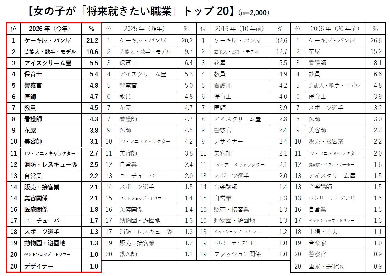 20年前と比較すると、「漫画家・イラストレーター」「音楽講師」「バレリーナ・ダンサー」「音楽家」「画家・芸術家」といった芸術系の職業の多くが20位圏外となりました。一方で、「アイスクリーム屋」「ユーチューバー」「動物園・遊園地」などのカワイイ仕事、「消防・レスキュー隊」「医療関係」といったエッセンシャルワークに憧れを抱く女の子が増えているようです。