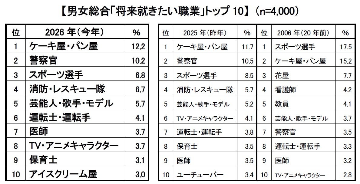 2026年版 新小学1年生の「将来就きたい職業」、親の「就かせたい職業」トップ3は「ケーキ屋・パン屋」「警察官」「スポーツ選手」
