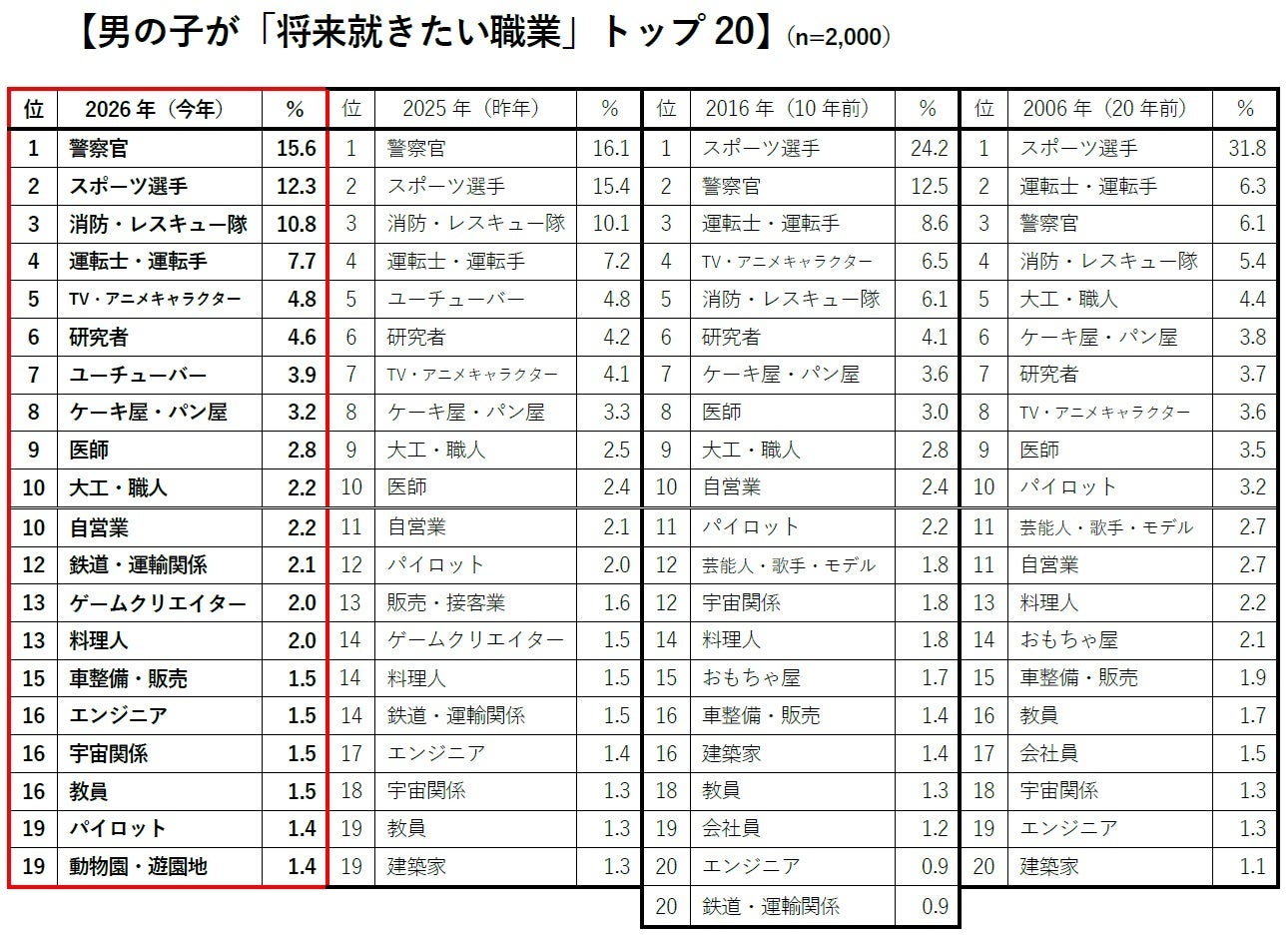 20年前との比較では、当時多くの男の子の憧れだった「スポーツ選手」が10.7ポイント減らして1位から3位に。男女両方で人気が高まっている「警察官」が6.7ポイント増やして7位から2位に上がりました。11位だった「消防・レスキュー隊」も3.9ポイント増やして4位に入り、人を助ける仕事への関心が高まっていることがうかがえました。