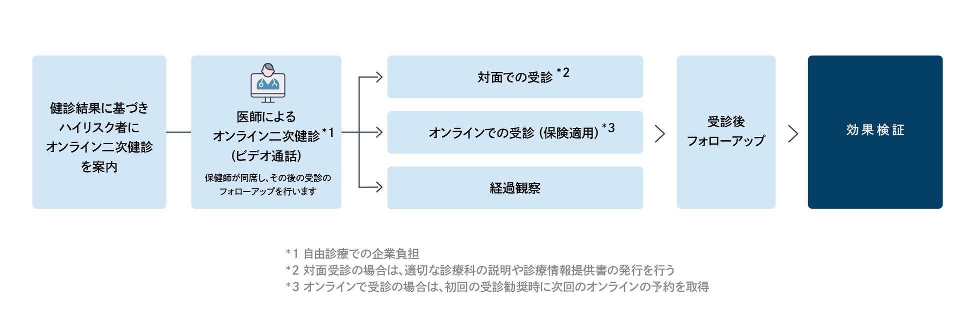 「オンライン二次健診」の案内は、健康診断結果から要検査・要治療などの指摘を受けた従業員に対して行います。本サービスでは、医師が従業員に対し健康リスクの説明を行ったうえで、適切な診療科の案内や治療に関する疑問の解消などを行い、対面受診が必要な場合には診療情報提供書によって地域の医療機関と適切に連携します。また仕事が多忙などの理由により対面受診が困難な場合は、ファストドクターのオンライン診療サービスを案内します。さらに受診方法を問わず、一定期間の受診が確認できない場合には保健師等が従業員にリマインドを行うことで治療からの離脱を軽減し、継続的な治療をサポートします。