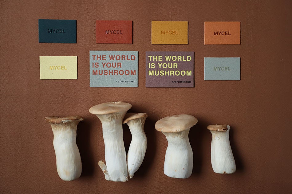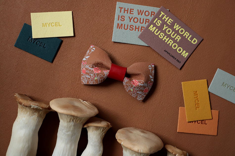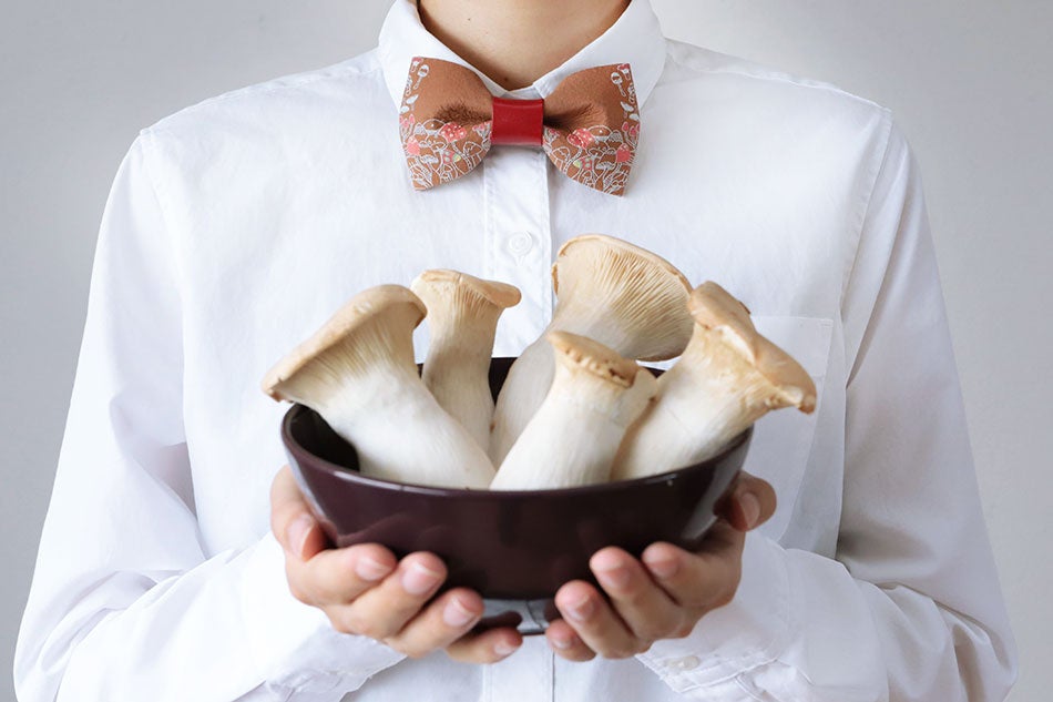 キノコの香りが楽しめる!?サスティナブルな新素材「マッシュルームレザー」をつかった、彦摩呂コラボ「革の蝶ネクタイ」にキノコ柄が登場。