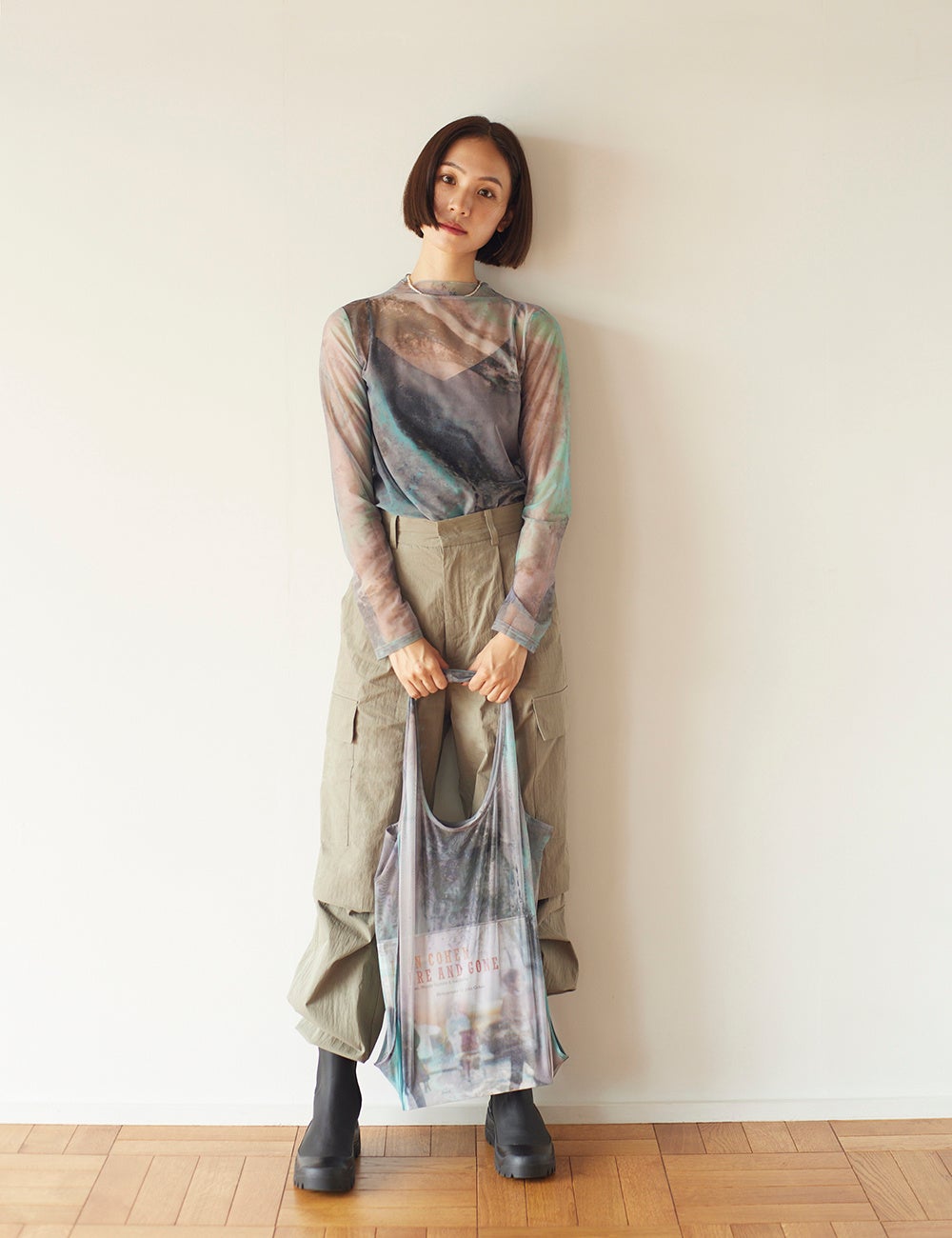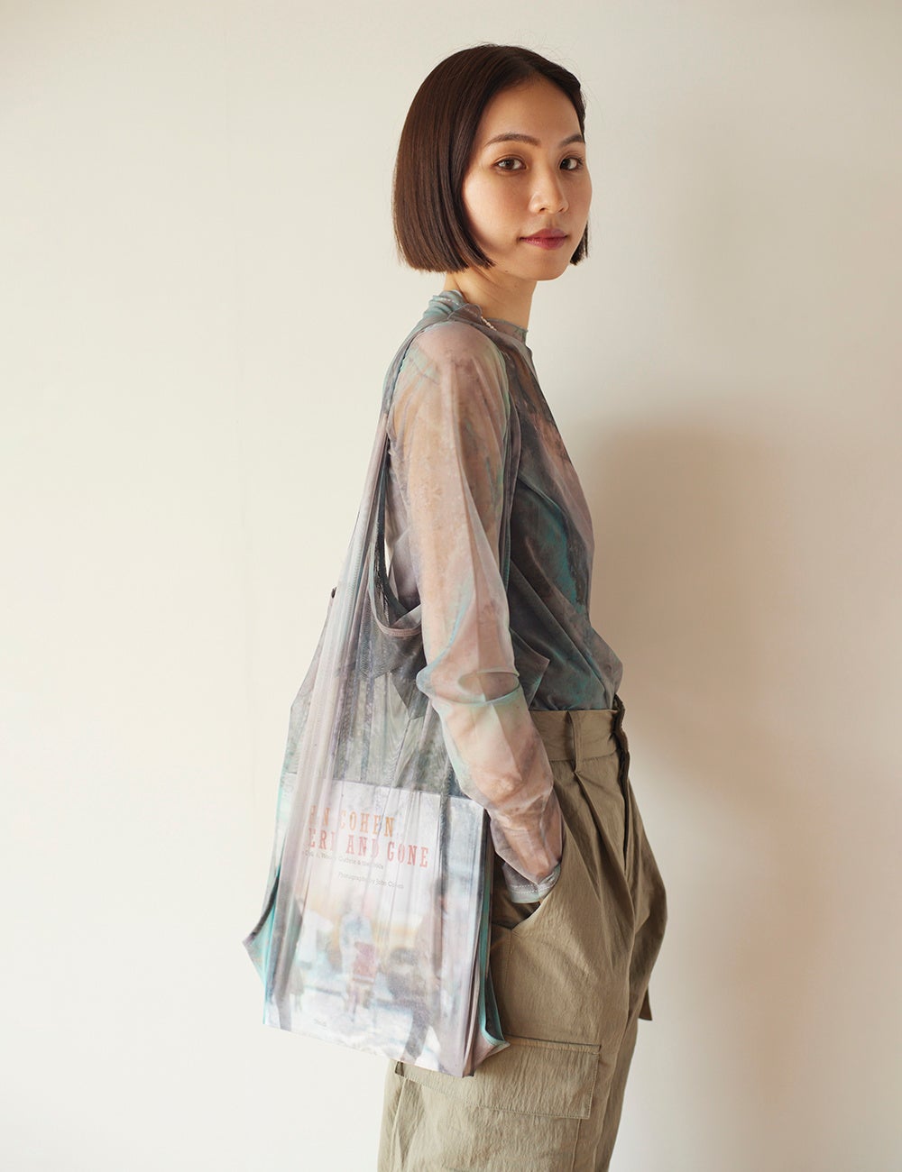 竹村さんの作品を落とし込んだRANDEBOOアイテムの中でも、手に取りやすく身近に感じていただけるようなバッグ。中に入れるもので、表情を変えるようなシースルー素材。コーディネートのワンポイントになるアクセントバッグに仕上げました。