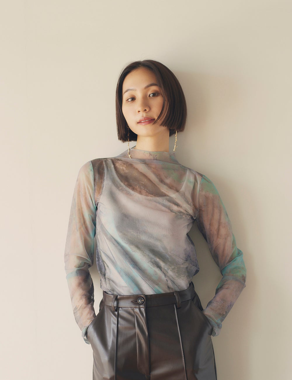 肌に溶け込むような、Neri柄を表現。バッグ同様、シアー感のある素材で製作しました。