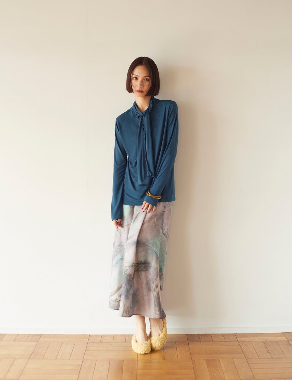 マーメードラインが走るサテン素材に、Neri柄をプリント。