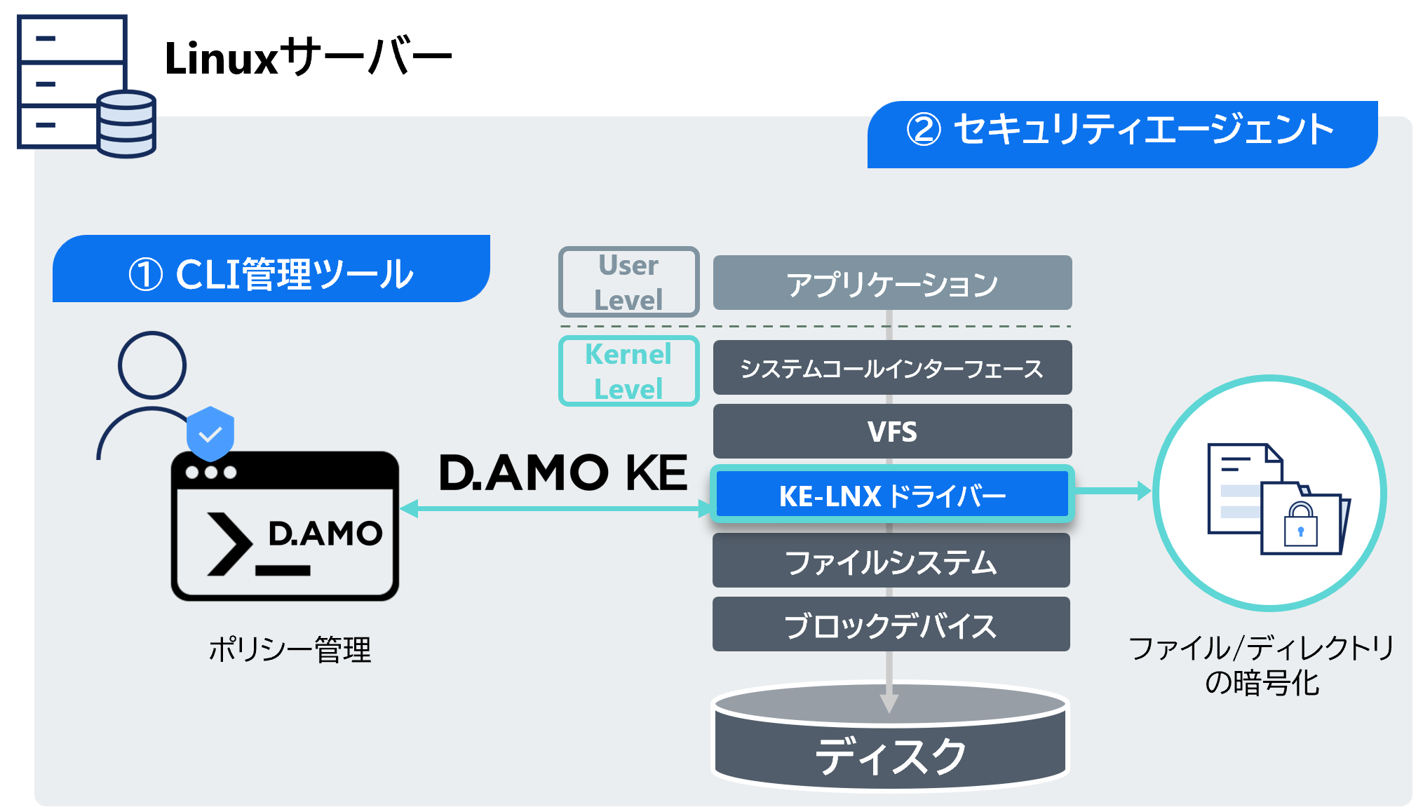 D.AMO KEは、サーバー側で個人情報や機密情報を含むファイル、データベースファイルなどをフォルダ/ディレクトリ単位でファイル形式を問わず暗号化して、安全に保存・管理できる製品で、Windowsサーバー向けの「D.AMO KE-WIN」、Linuxサーバー向けの「D.AMO KE-LNX」の2種類があります。ワンクリックで簡単にセットアップでき、暗号化による性能劣化を最小限に抑えて運用できるのが特長です。また、非管理者のアクセスを遮断するため、HDDの盗難・紛失時のデータ漏えい事故やランサムウェアによる被害を効果的に防ぐことができます。