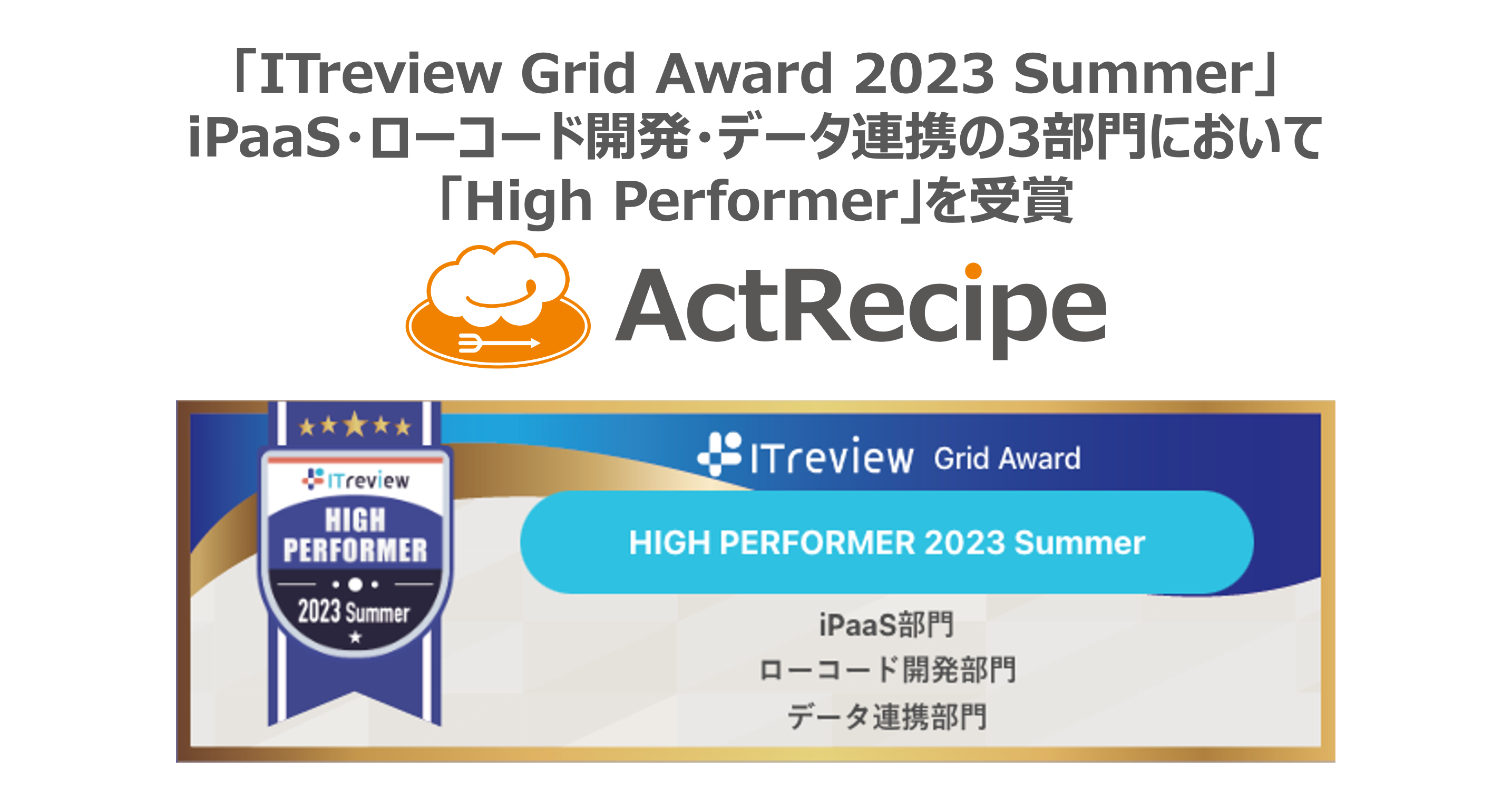 iPaaS「ActRecipe」が「ITreview Grid Award 2023 Summer」において3部門で「High Performer」を受賞