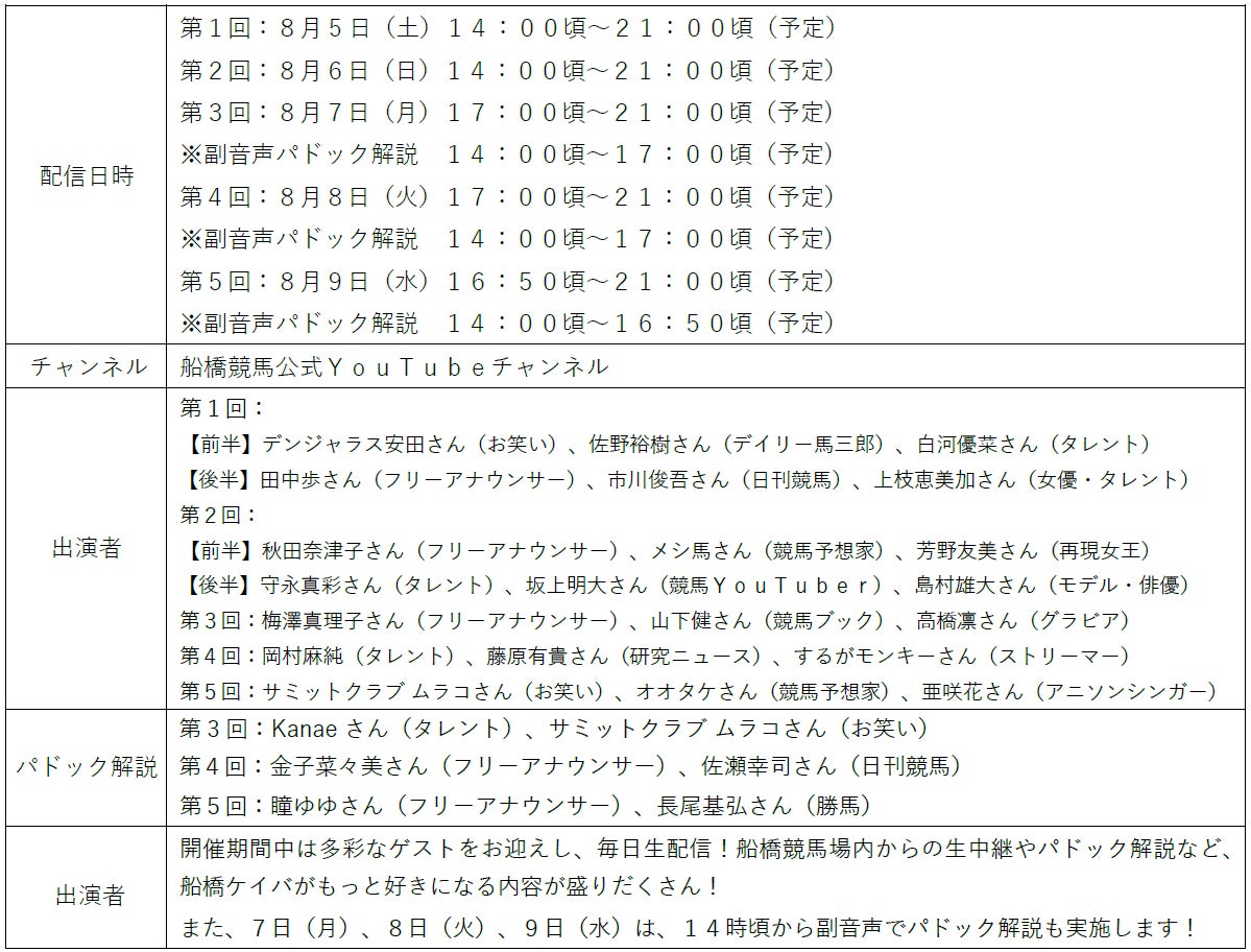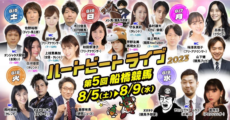 船橋ケイバでは、令和5年度第5回開催を8月5日(土)~8月9日(水)に開催いたします。場内イベントのお知らせは次頁以降に詳細を記載しておりますのでご覧ください。滞留人数が3,000人を超えた時点で入場制限を行うことがありますので、あらかじめご了承ください。
