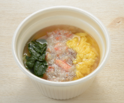 紅ずわいがにをトッピングしたスープご飯です。かきたまごと小松菜で彩りよく仕上げました。魚介の旨みがつまったとろみのあるスープで寒い時期にぴったりの商品です。