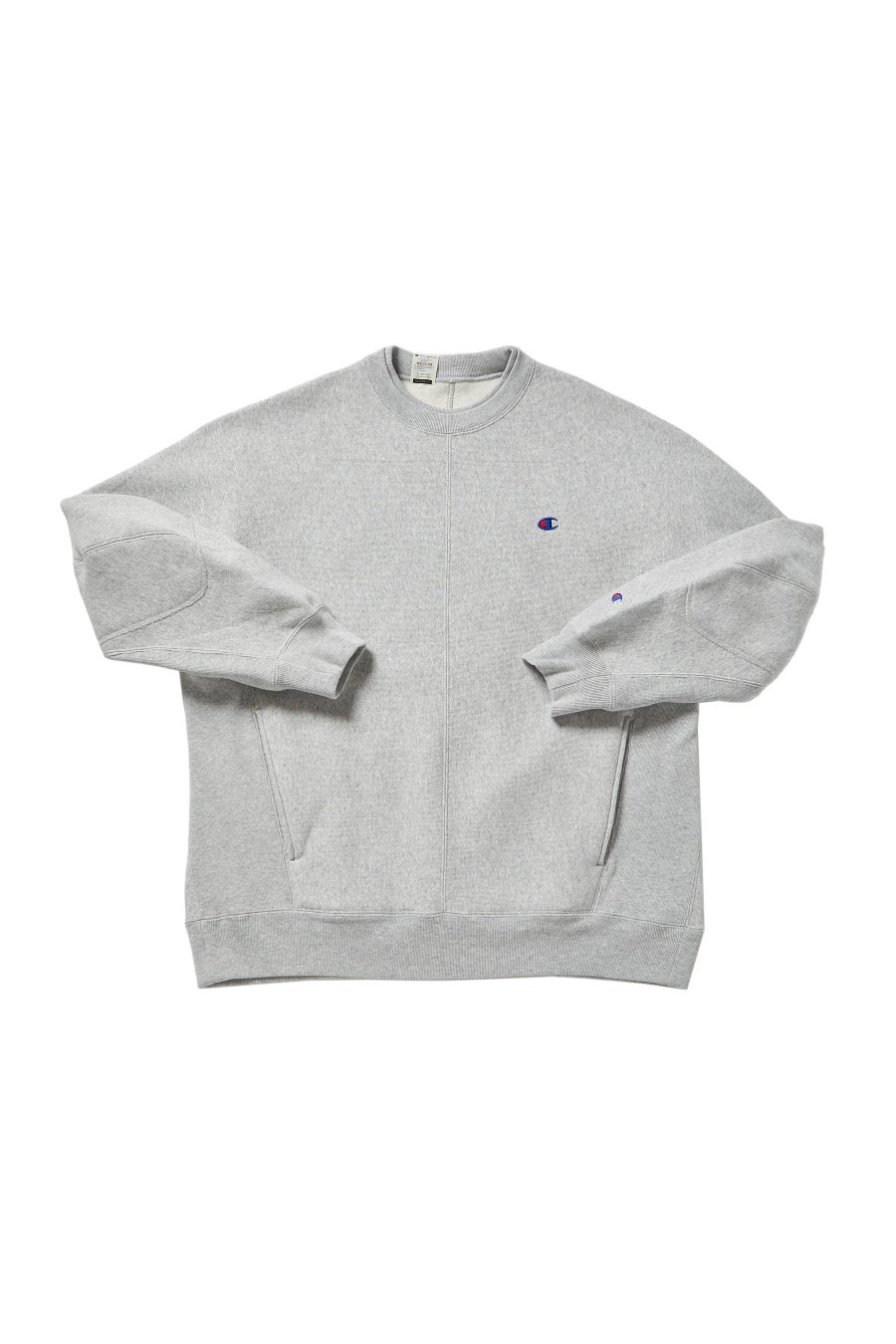 N.HOOLYWOOD とのコラボレーションによる、Champion を代表する製法の「REVERSE WEAVE®」を実験的に再構築し、「NEW WEAVE」と名付けたカプセルコレクション第二弾。着込むほどに独特の風合いや味わいが出る11.5oz(11.5オンス)の裏起毛素材を身体に沿った立体裁断で組み上げ、前身頃からスリーブの上部、後身頃にかけて一枚の生地で製作したクルーネックスウェットシャツです。ゆったりとしたワイドシルエットと、内側に入り込むような丸みを持たせたフォルムのスリーブが特長。両脇には「EXPANSION GUSSET(エクスパンションガゼット)」、カンガルーポケットの代わりにシームポケットを付けました。第二弾では、センターシームに仕様変更、ネック部分も1990年代のUSAチャンピオンのプロダクトにみられたユニークなレイヤードリブ(2重リブ)を採用、エルボーパッチを追加しています。