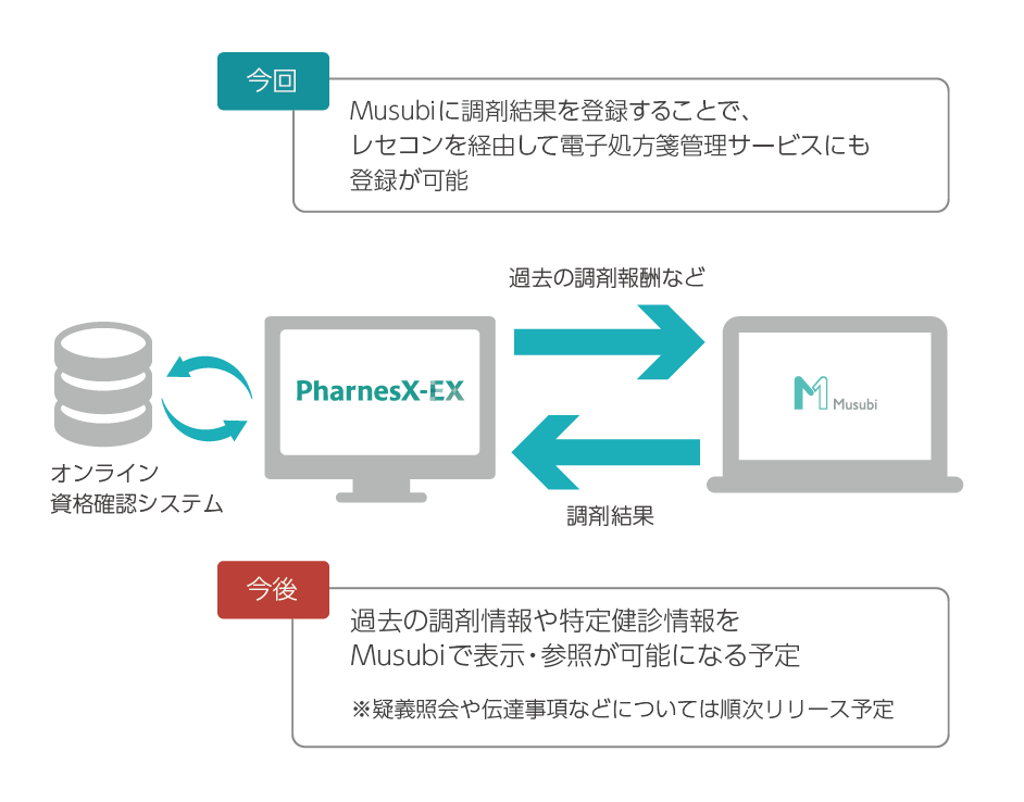 今回の連携機能により、Musubiに調剤結果を記録するだけで、レセコンを経由して電子処方箋管理サービスにも同様の情報が登録されます(サービス提供時期は2024年2月以降を予定)。