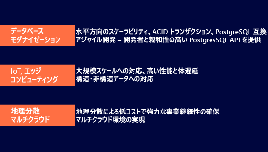 アプリケーションに加えデータベースについてもモダナイゼーション拡張を行うには、従来のRDB(リレーショナルデータベース)/NoSQL (非リレーショナル)ではない、RDBのトレードオフを排除した、クラウドネイティブなアプリケーションをサポートするデータベースが必要です。