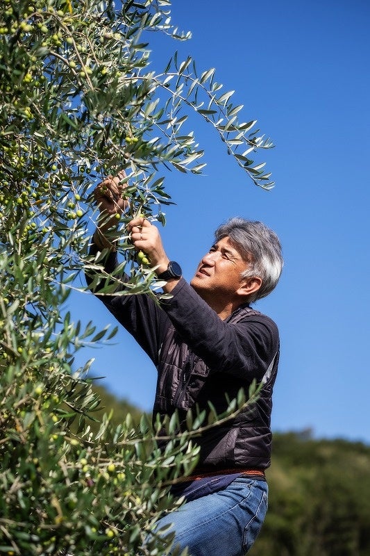オリーブを収穫する3代目園主の息子・井上健也