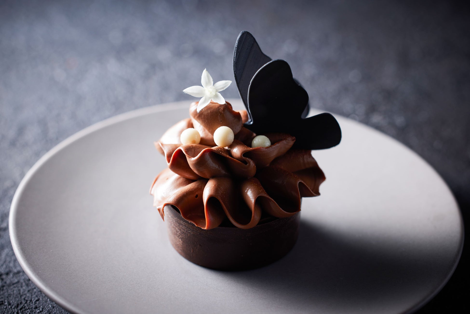 ドレスのフリルのように絞られたチョコレートクリームが華やかなタルトです。米粉を使用したグルテンフリーのクランブルと、ナッツのムースを合わせました。パールショコラとブラックの蝶がアイコニックなスイーツは、ランウェイに登場しそうなエレガンスなビジュアルにこだわりました。