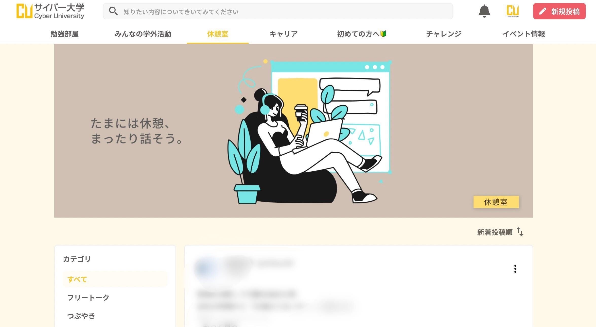 サイバー大学公式コミュニティは、2022年4月にリニューアルし、授業から学外活動まで幅広い学生生活をオンライン上で学生・卒業生・教職員が相互にサポートし、交流を深める場となっています。そのため、 多様な価値観や背景を持ちながら、IT・ビジネスを学ぶ同志とのコミュニケーションを楽しみながら学習を進めることができます。コミュニティ内には豊富なコンテンツが用意されており、サイバー大学での学生生活をより充実させることができる場となっています。