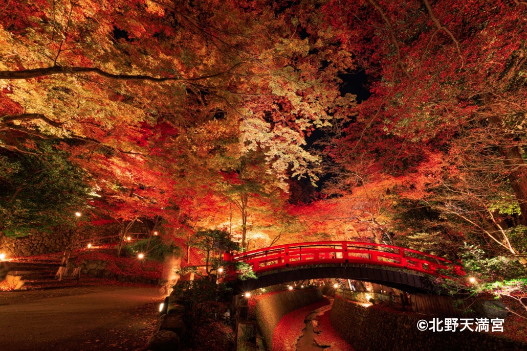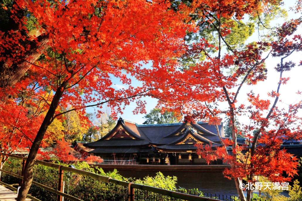 天暦元年(947)に創建された、全国に約1万2000社ある天神社・天満宮の総本社。平安時代に学者・政治家として活躍した菅原道真公を御祭神とし、古来「北野の天神さま」と親しまれ、入試合格・学業成就・文化芸能・災難厄除祈願のお社として幅広く信仰されている。国宝である御本殿は豊臣秀頼公が造営したもので、八棟造と称される絢爛豪華(けんらんごうか)な桃山建築。毎月25日の縁日では宝物殿の特別公開が行われ、境内には多くの露店が立ち並んでにぎわいを見せる。また、梅と紅葉の名所としても名高い。