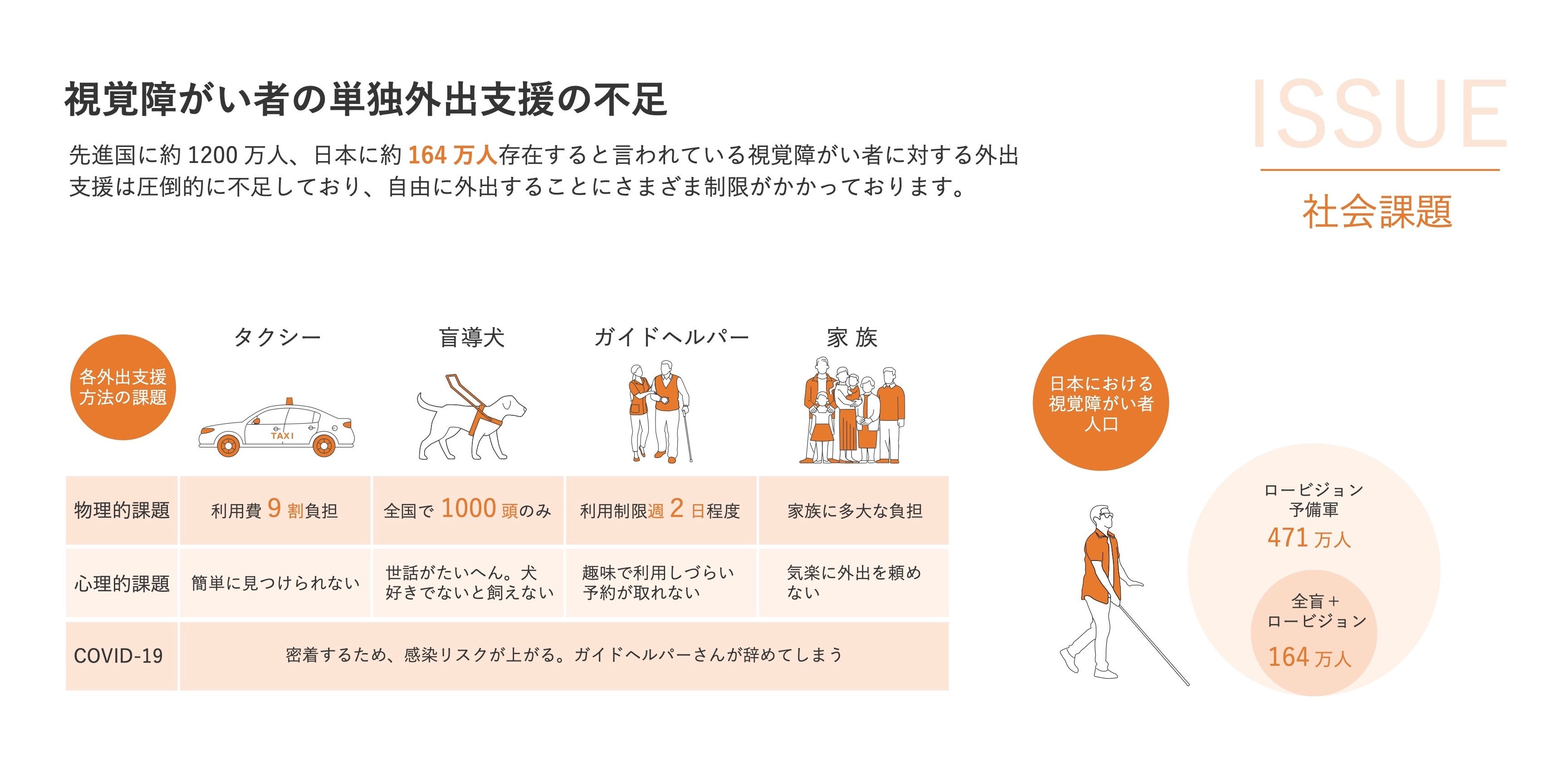 先進国に1200万人、日本全国に164万人の視覚障がい者の方は、自由に外出することに様々な制限があります。また外出が困難であるため、うつ病のリスクが晴眼者に比べ3.5倍以上高いというデータが存在します。Ashiraseは、聴覚や手の触覚等視覚障がい者の方々の歩行に重要な感覚を損なわず、単独で自立した外出を可能とする視覚障がい者向けナビゲーションシステム「あしらせ」を開発しました。あしらせにより視覚障がい者の方の単独で自由な外出を、そして心を健やかに保ち、「人の豊かさを”歩く”で創る」を実現します。