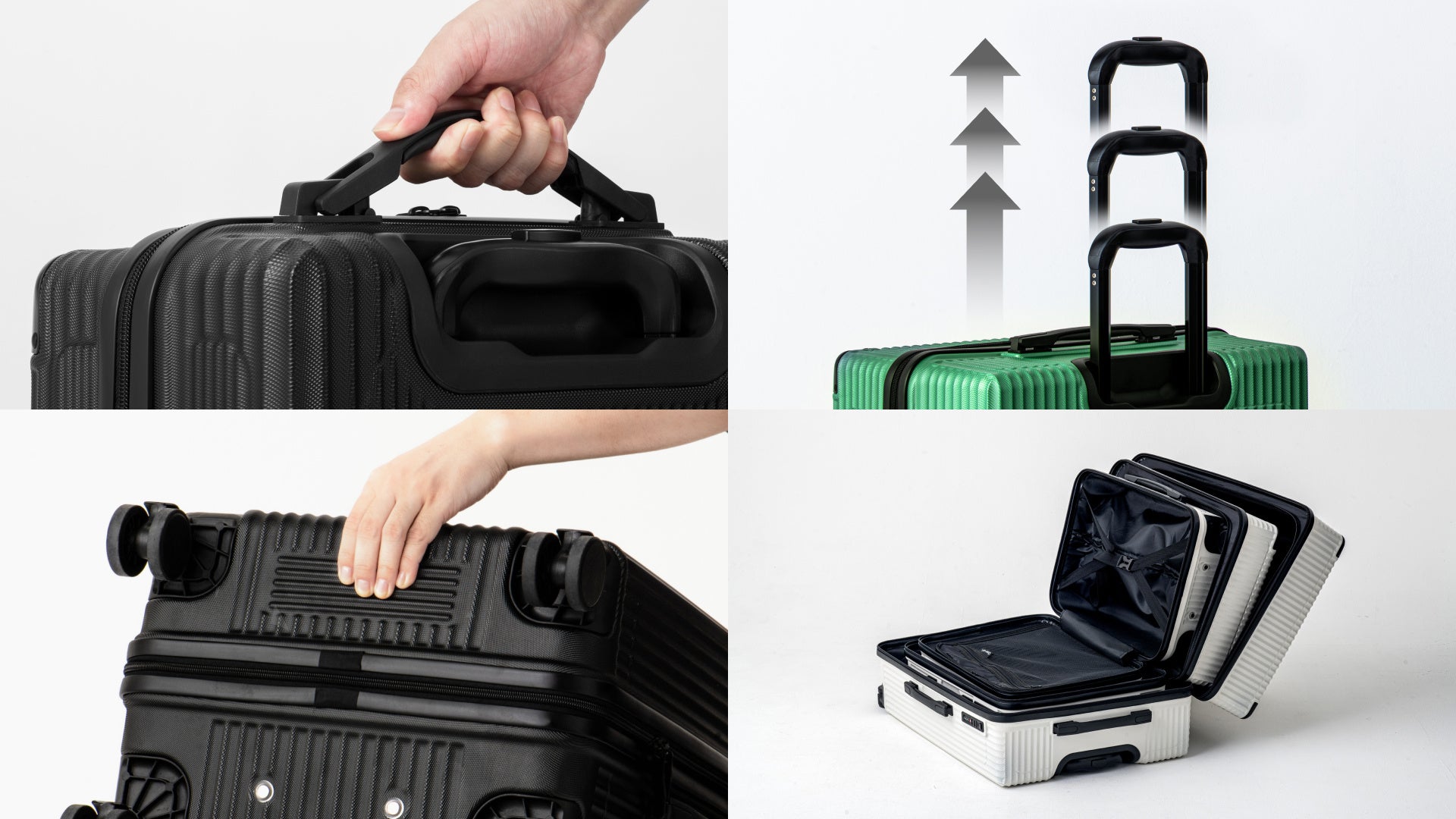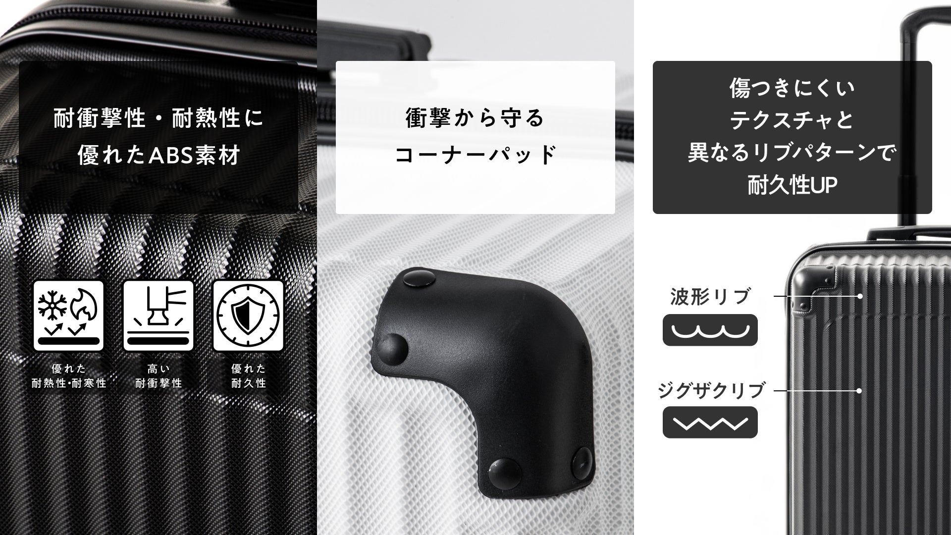 ボディには、衝撃・熱・寒さに強く、耐久性に優れたABS素材を採用。 傷つきにくいテクスチャ(表面構造)と、2種類の異なる縦向きリブパターン(凹凸構造)を用いることで、さらに耐久性を高めた設計となっています。また角にはアルミニウムのコーナーパッドを搭載し、外部から衝撃が加わったときも大切な荷物を保護できるようにしました。