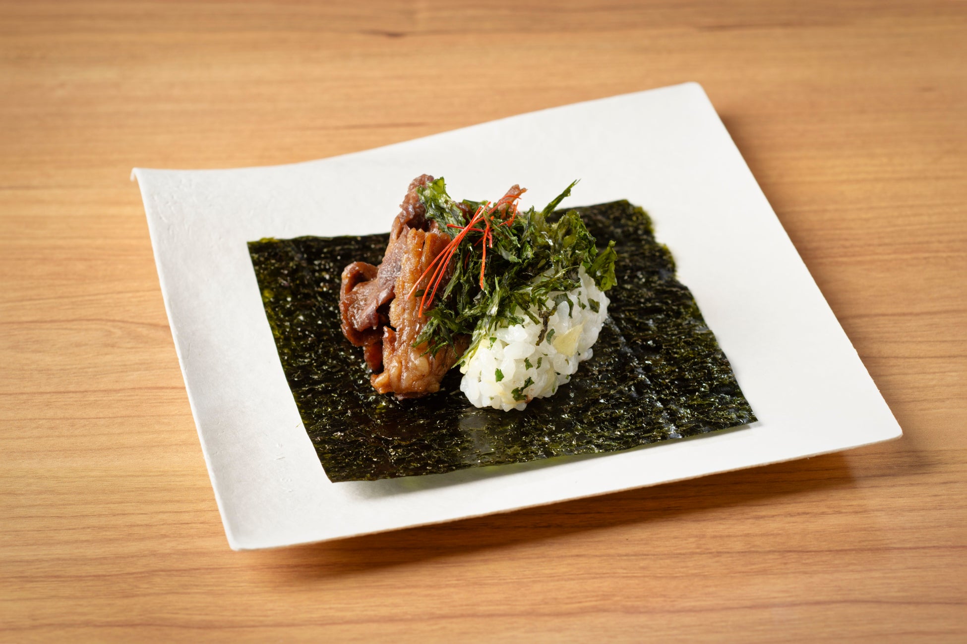 牛肉を香ばしく焼き上げてから、特製のすき焼きの割り下で煮たすき焼き煮。それを、千葉県産コシヒカリに抹茶の原料の茶葉「碾(てん)茶」と、生姜の甘酢漬けを混ぜた酢飯に添えました。海苔は、有明産の高級海苔と、香り高いバラ干し海苔を使っています。牛の旨みを感じる甘辛のすき焼き煮と、海苔の香りの取り合わせが醸し出す豊かな味わいをお楽しみください。