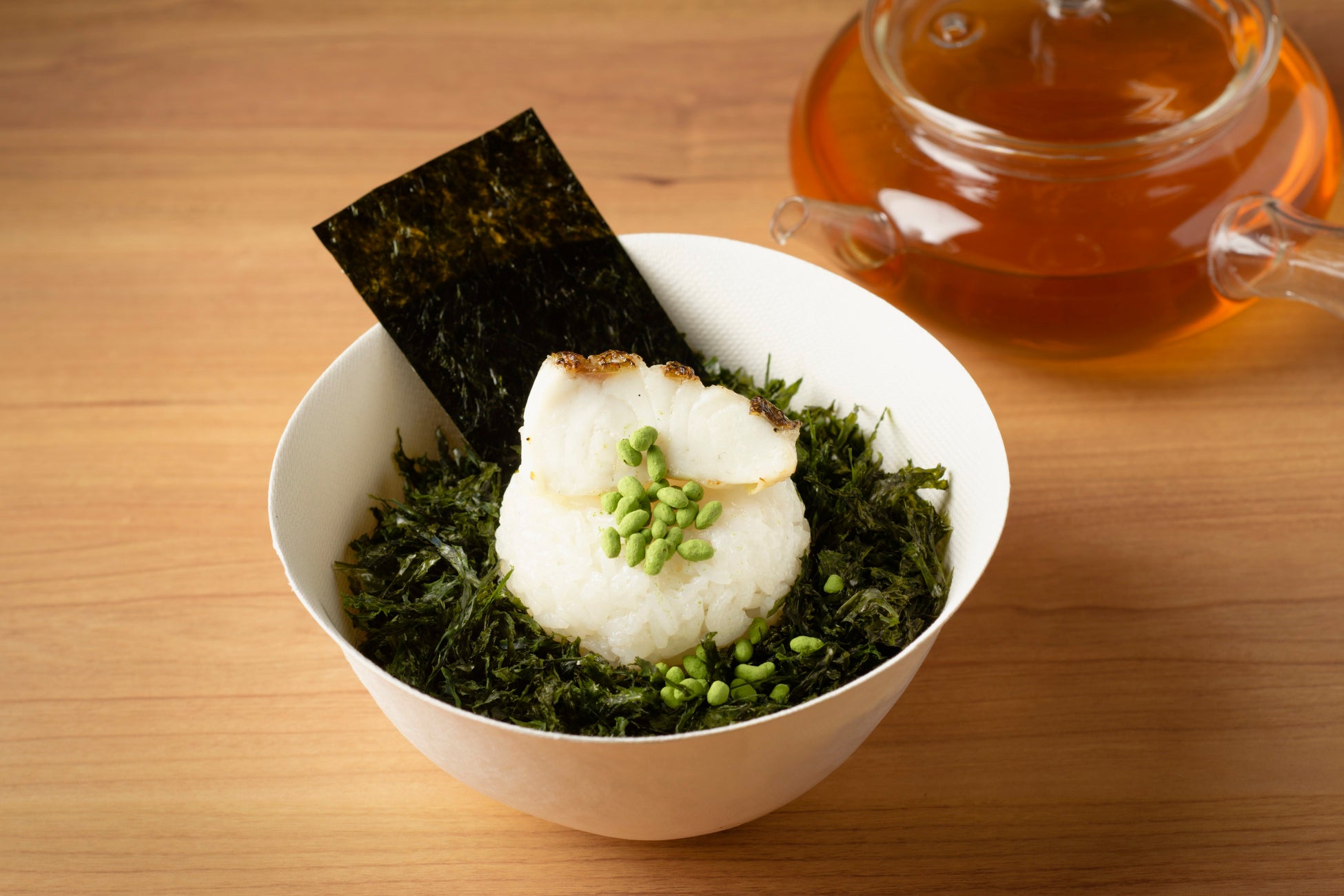 今回出店するふじヱ茶房は、上質なお茶と海苔を気軽に楽しんでいただける「CRAFT SAKE WEEK」限定メニューをご用意しました。「鯛出汁茶漬け」は、山本山が厳選した2種の海苔をふんだんに使用し、かつお・昆布・椎茸から取った出汁と、高温で芯までじっくりと火入れした苦みや渋みが少なくさっぱりとしたほうじ茶を合わせたほうじ茶出汁が特徴のお茶漬けです。