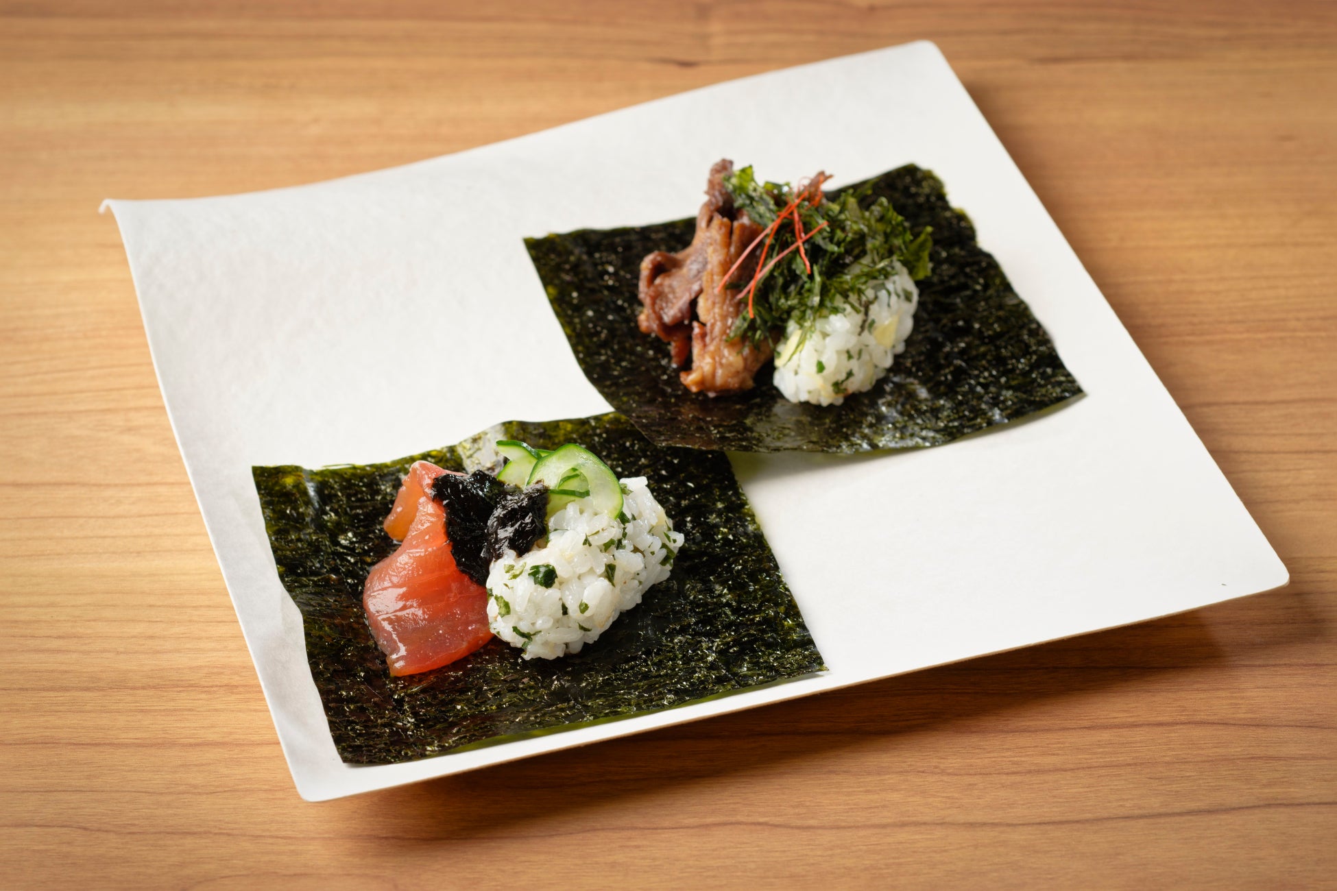 「牛すき焼き風」、「漬けまぐろ」のお得な手巻き寿司のセットです。「牛すき焼き風」は味わい深い甘辛だれでじっくり煮込んだ牛肉と香り高い海苔の組み合わせ。「漬けまぐろ」はそれぞれの特徴を楽しめる異なる趣向の海苔3種でいただく手巻き寿司です。海苔の個性の違いを日本酒と共にお楽しみください。