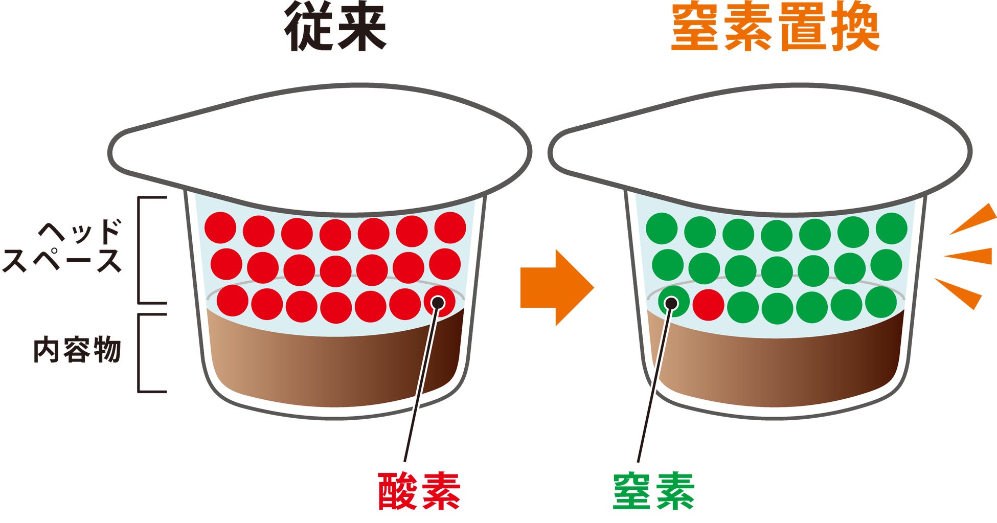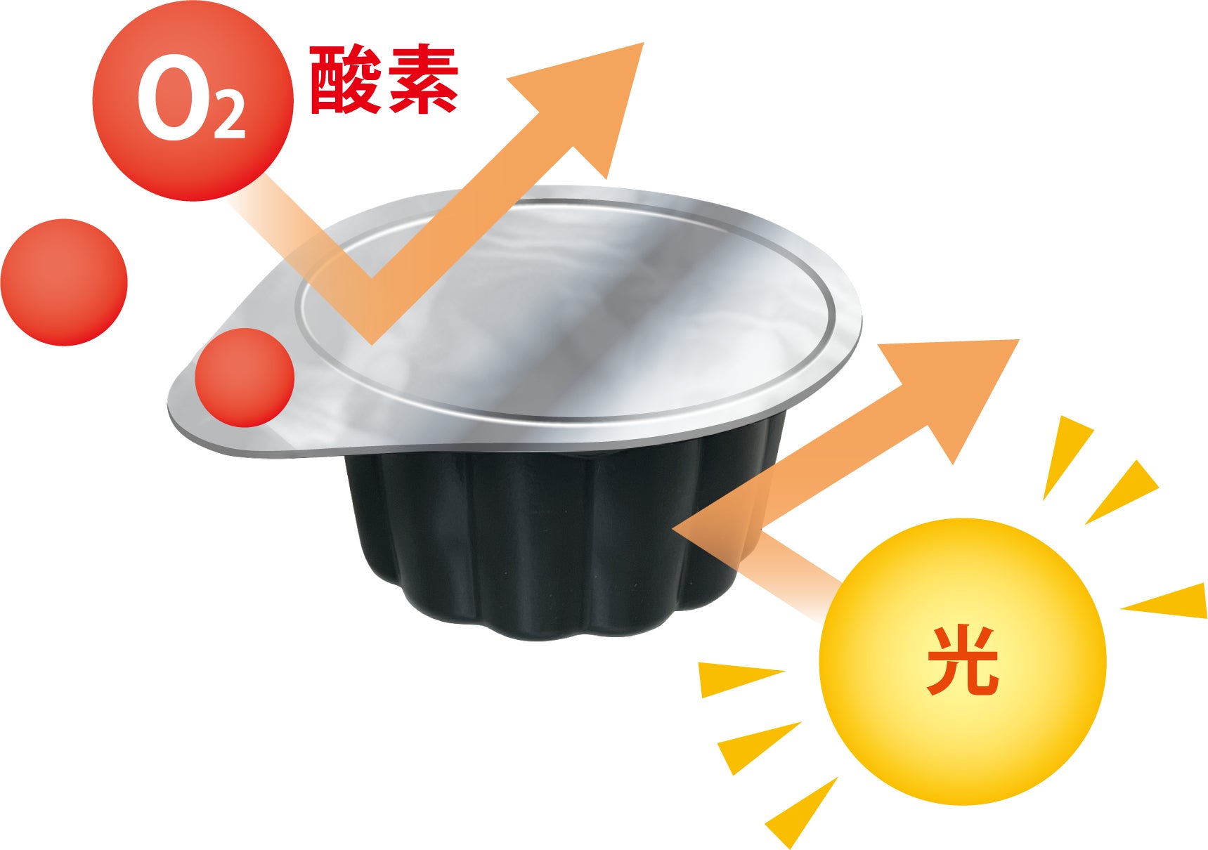 酸素や光から中身を守り、容器内の酸素を減らし酸化を防ぎます。