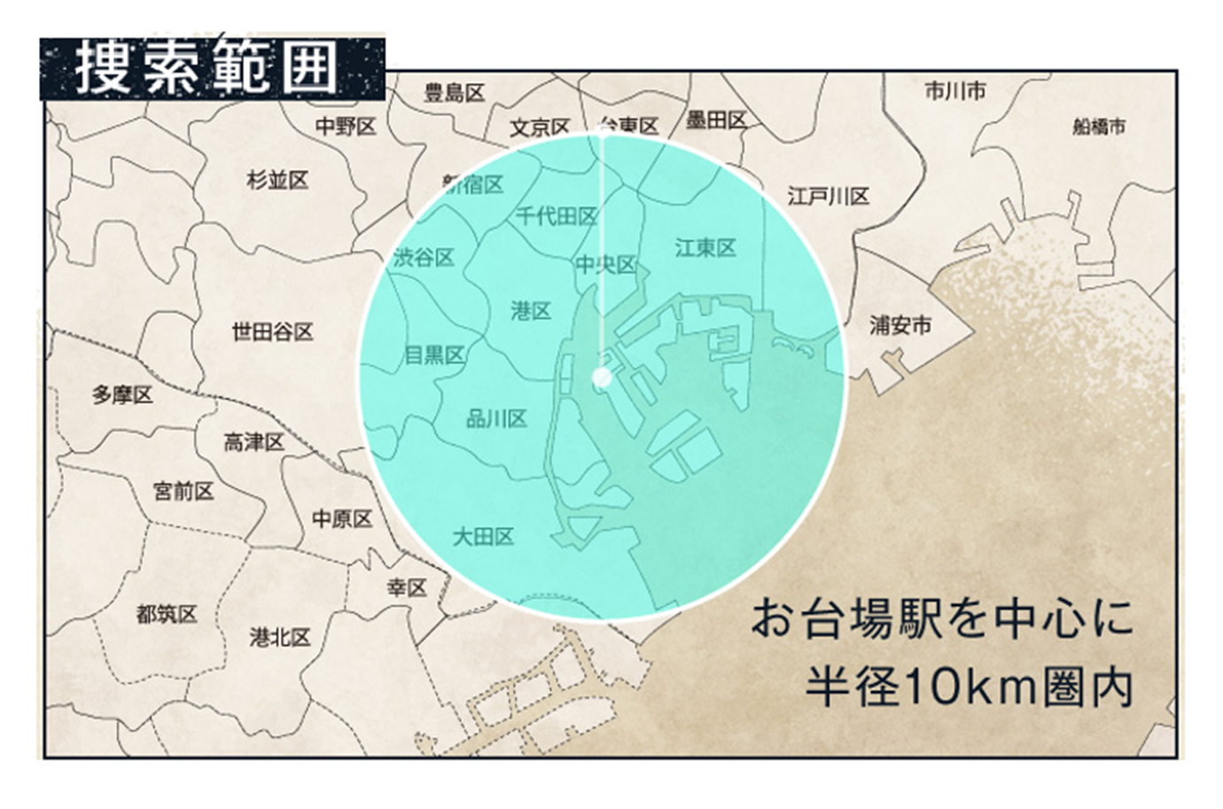 開催場所:ゆりかもめ「台場」駅から半径10km圏内