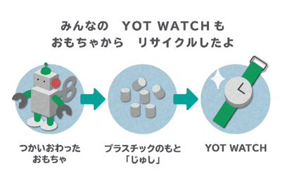 YOT WATCH は、⼦どもたちが使っていたプラスチックのおもちゃを回収・リサイクルして作られた腕時計。