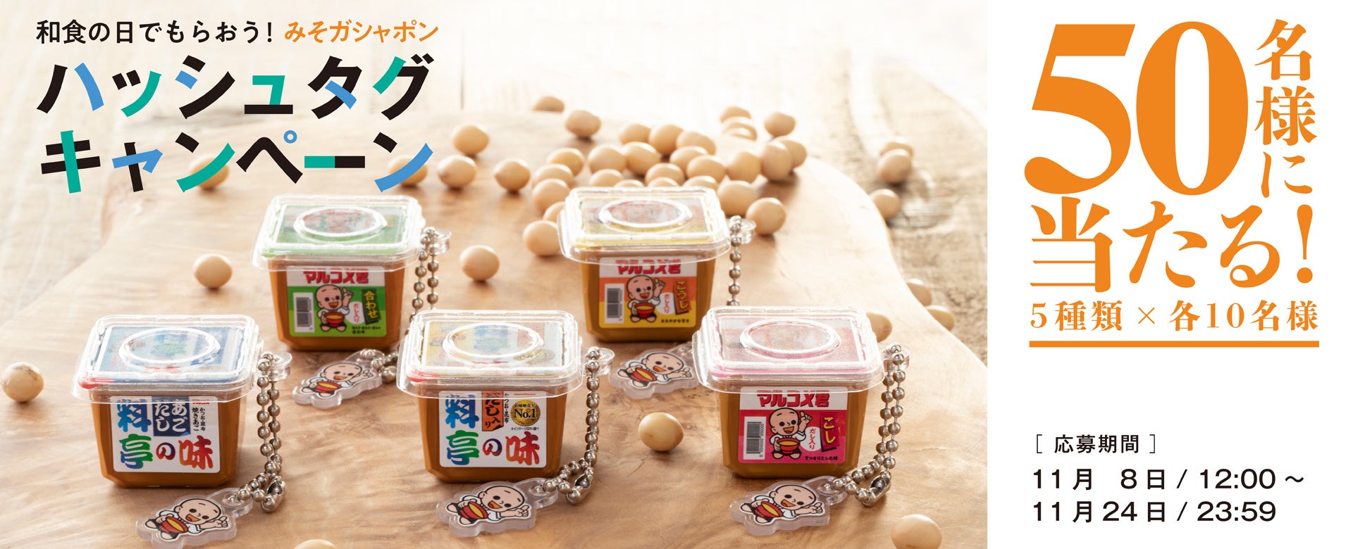 本商品の発売を記念し、Twitter にて「和食の日でもらおう!みそガシャポン」ハッシュタグキャンペーンを実施 いたします。下記方法でキャンペーン期間中にお申し込みいただいた方の中から抽選で 50 名様に、「マルコメ ミニパッケージチャーム(1 点)」と「該当のマルコメ商品(1 点)」のセットをプレゼントいたします。