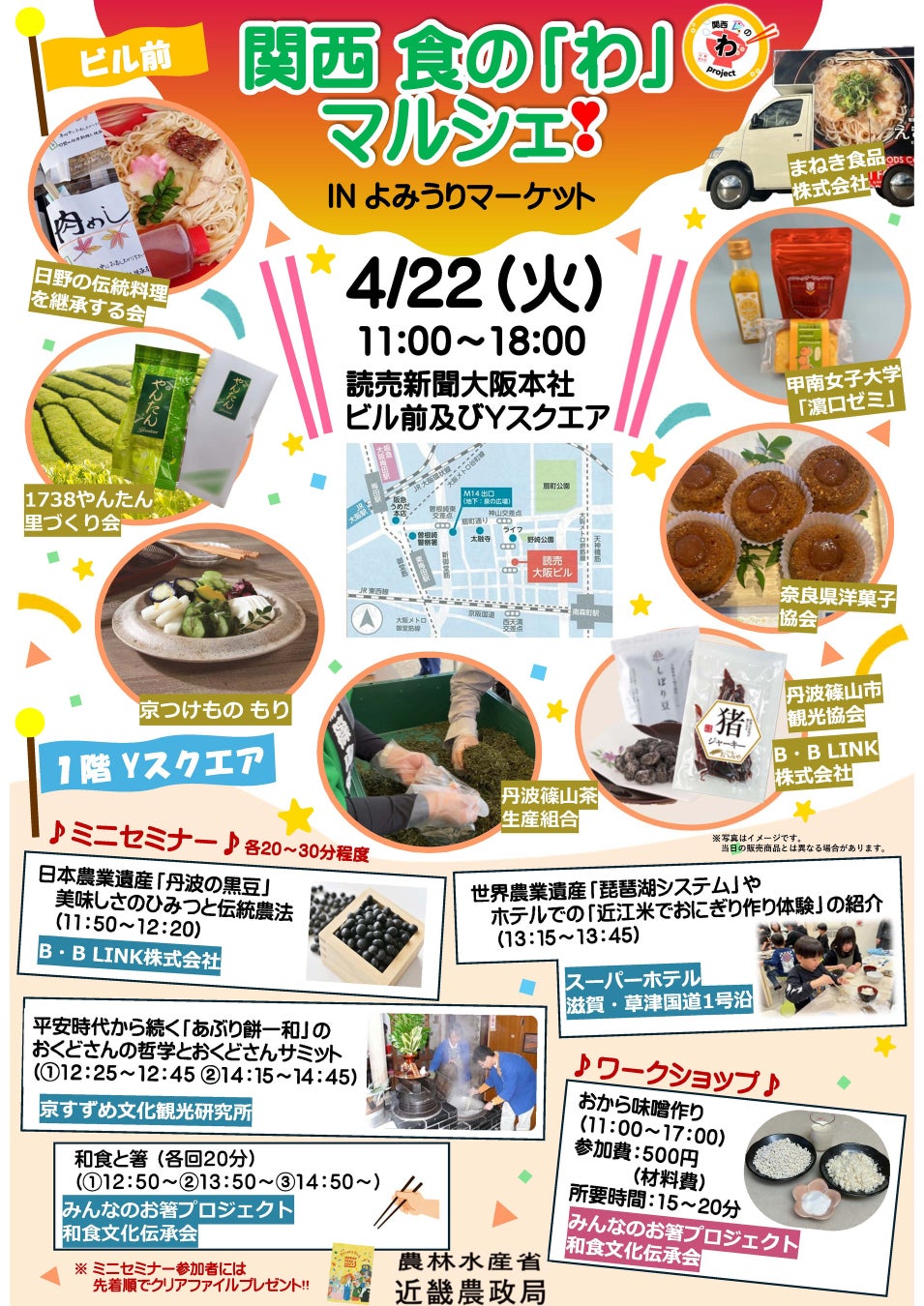 今回、読売新聞大阪本社主催の「よみうりマーケット」と連携して、4月22日(火曜日)に関西 食の「わ」プログラムに認定された企業・団体によるミニセミナー、ワークショップ、展示や関西の食の販売を行う「関西 食の「わ」マルシェ!」を開催します。ぜひ、お立ち寄りください。
