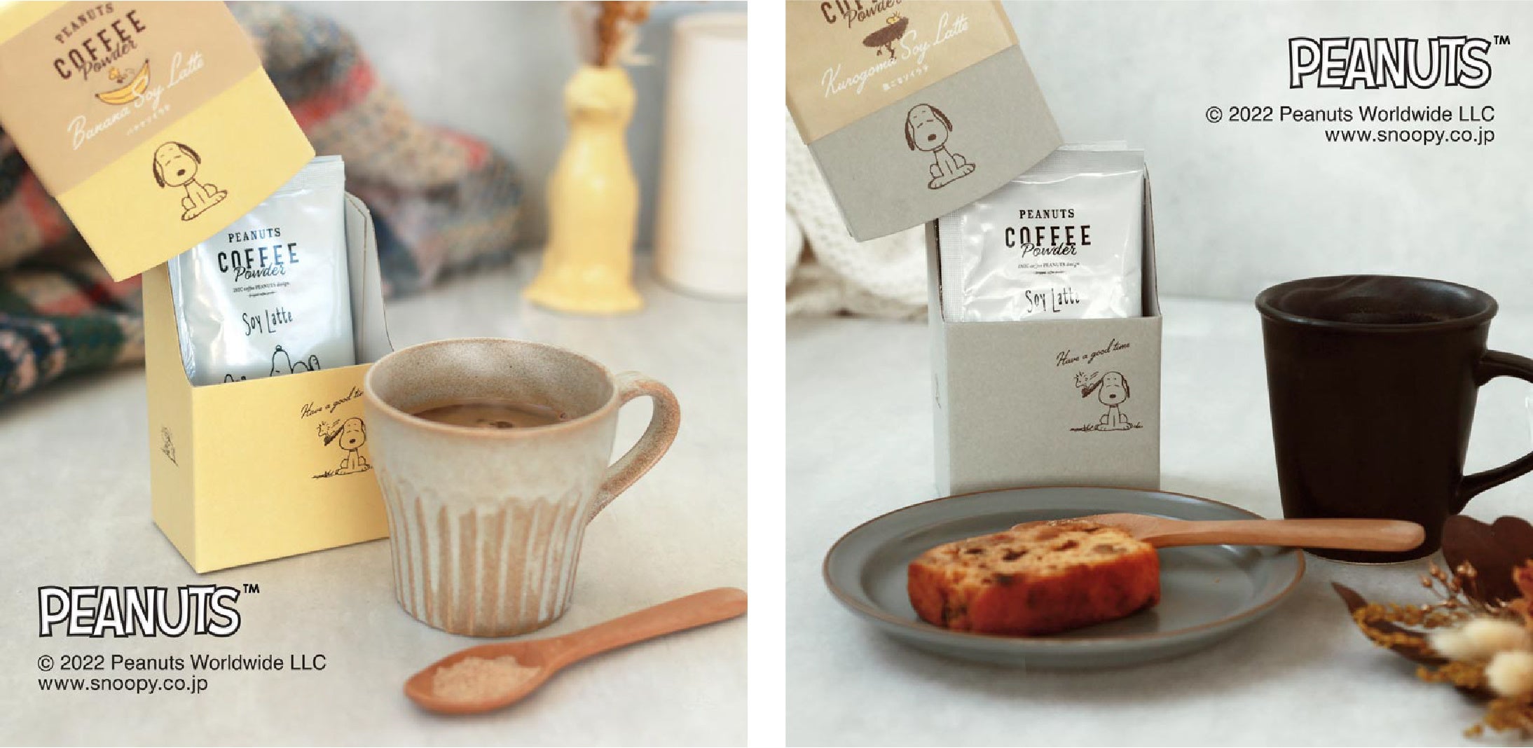パウダーフーズフォレスト株式会社(本社:愛知県名古屋市、代表取締役CEO:森永 照久)は、「SNOOPY coffee」から「バナナソイラテ」「黒ごまソイラテ」を新発売しました。各2杯入りの単品ボックスと、定番のプレーンソイラテとあわせたアソートボトルにて販売いたします。カフェのような本格フレーバー、お湯だけで作ることができる簡単さ、アフターユースできる可愛らしいパッケージという3つのポイントで、充実した秋冬のコーヒーブレイクやギフト選びをご提案します。公式オンラインストアのほか、全国のセレクトショップ様・書店様の店頭でも順次販売予定です。