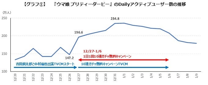 『ウマ娘 プリティーダービー』は年末年始にかけて、主にテレビCMと無料ガチャの2つの施策が行われていました。