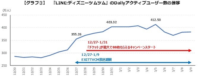さらに、ゲーム内アイテムである「プレイチケット」が最大で88枚もらえるキャンペーンなどが行われており、キャンペーンが開始された12月28日にはアクティブユーザー数が急増して355万人を超え、それ以降も右肩上がりに増加。12月31日にはアクティブユーザー数が400万を突破しました。【グラフ③】
