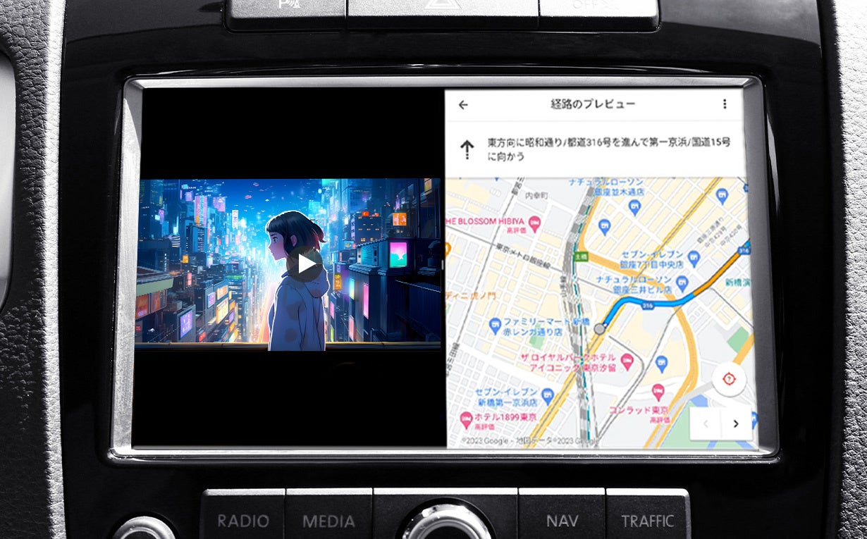 助手席では動画を見たいけど、運転者はマップを確認したい!というときに最適な2分割表示です。