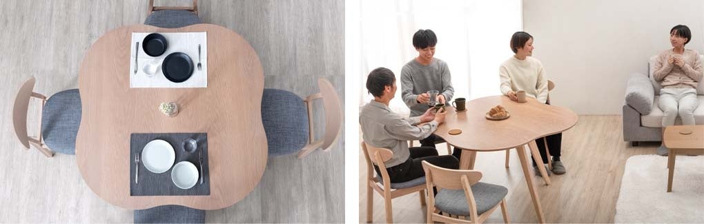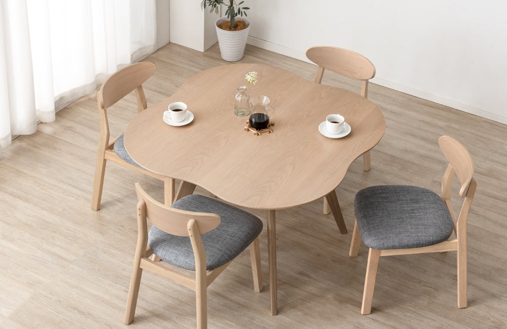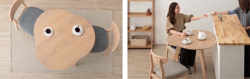 一般的に天板の形が長方形や正方形など『四角形』になっているダイニングテーブルが多くみられる中、今回タンスのゲンから『三つ葉型』『四つ葉型』『円形』『楕円形』4種類のテーブルが登場しました。どのモデルも天板が丸みを帯びて、柔らかな印象を持っています。