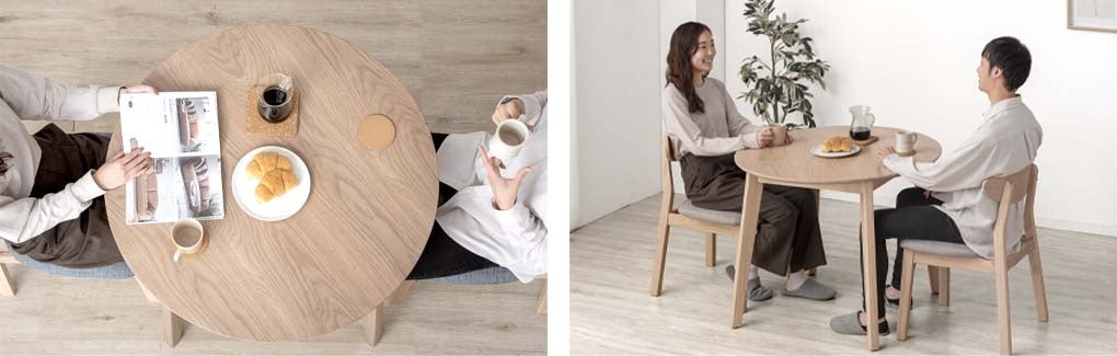 直径90cmとコンパクトなサイズ感で、圧迫感の少ないデザインとなっており、省スペースでダイニングを設置したい方にもおすすめのテーブルです。2~3人でゆったりとご使用いただけるサイズ感になっています。