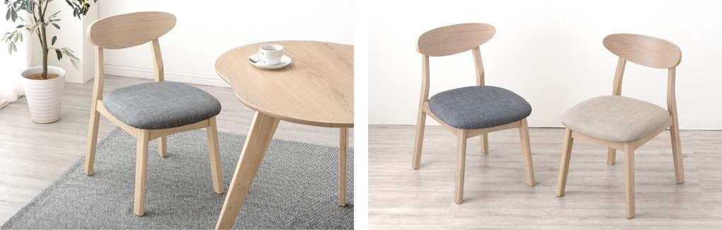 ダイニングチェアもテーブルに合わせ北欧テイストになっており、天然木のフレームと座面のファブリック生地がナチュラルな暖かさを演出します。