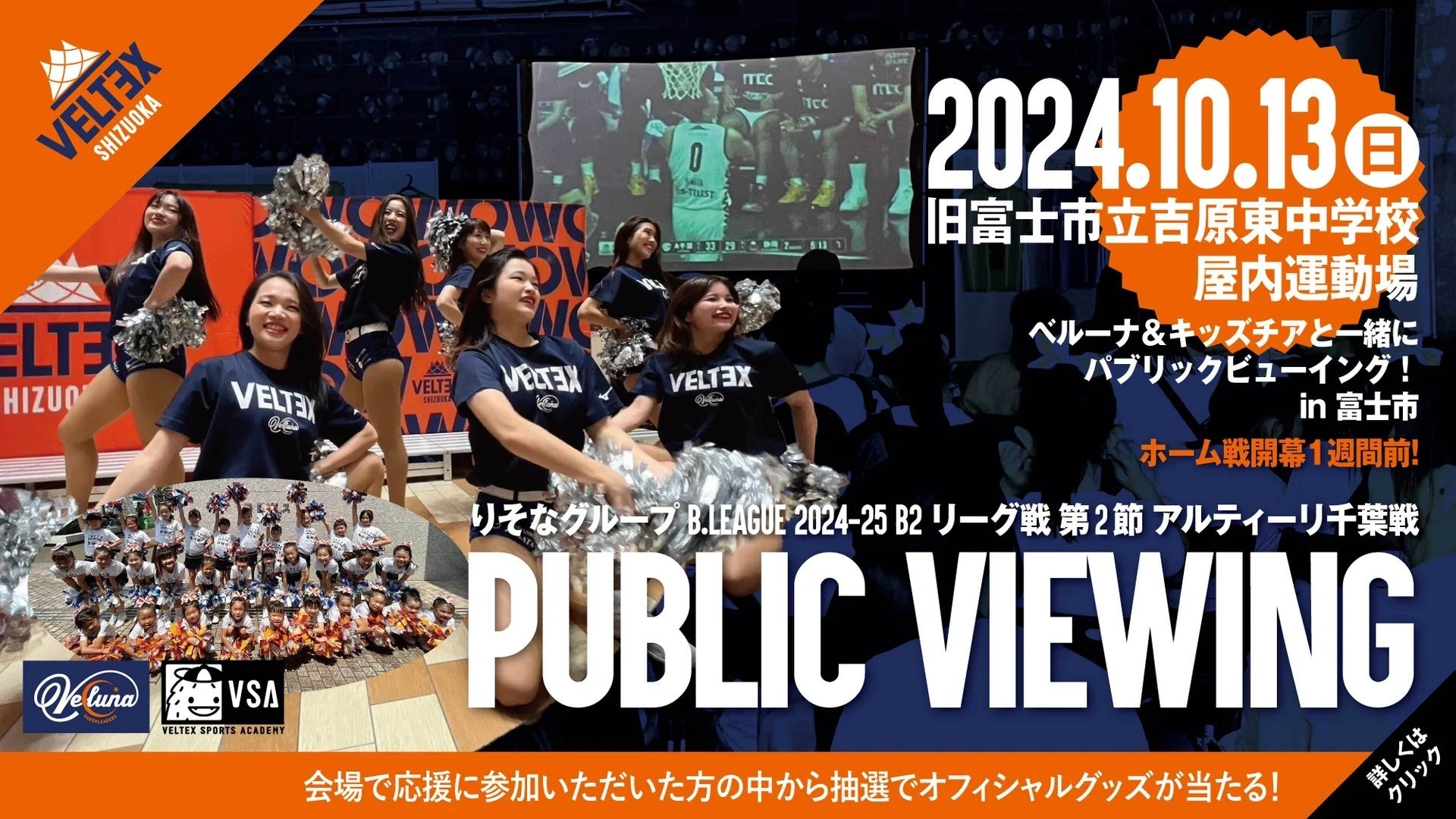 ベルテックス静岡は富士市との協働で10月13日(日)に開催される、りそなグループ B.LEAGUE 2024-25 SEASON 第2節 アルティーリ千葉戦のパブリックビューイング開催いたします。