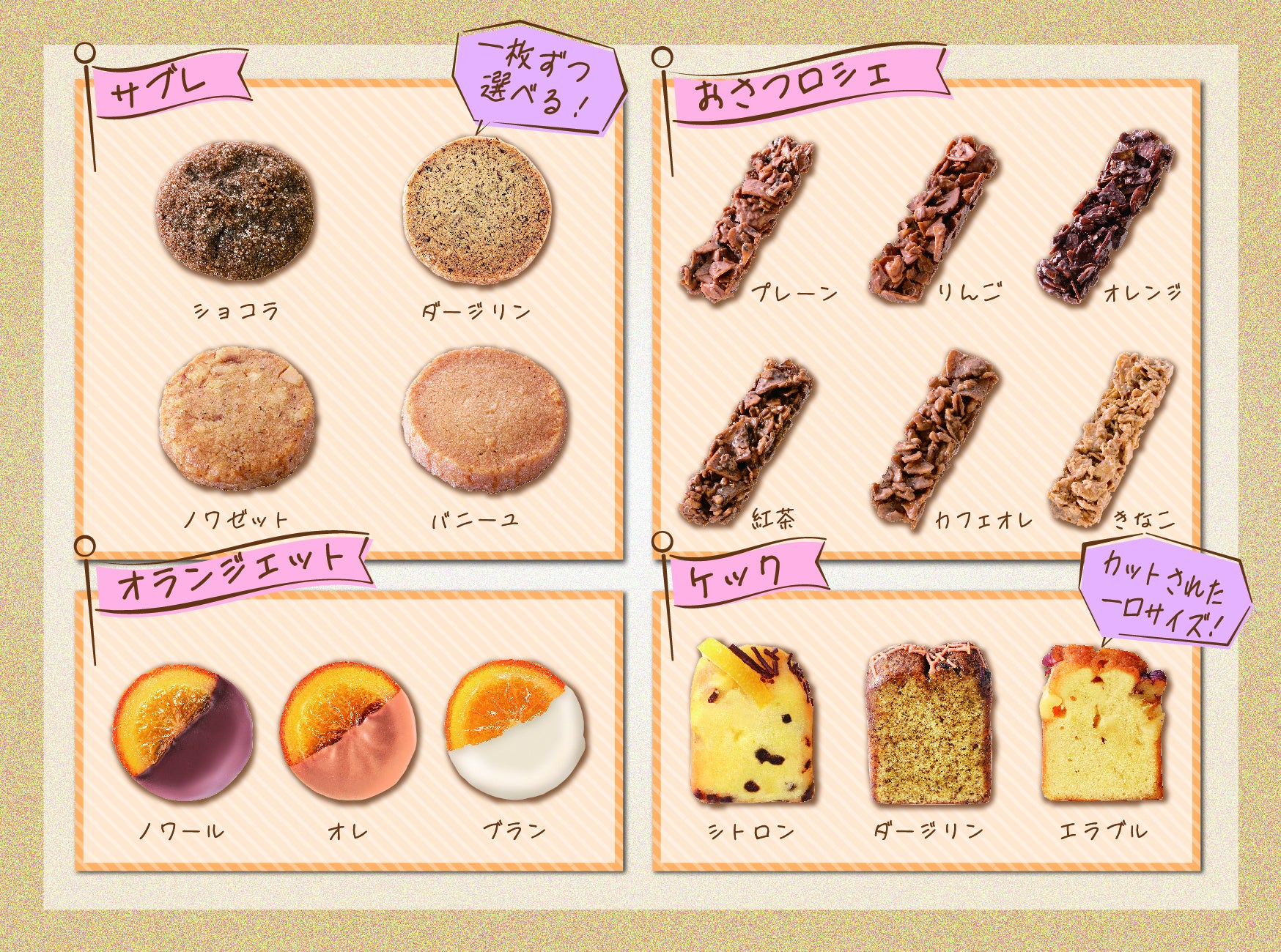 3種のチョコレートでディップされたオランジェット、UHA味覚糖の代表的なスナック「おさつどきっ」を使用したおさつロシェ6種を始め、しっとりとした食感が特徴のケック3種、素材を生かし、食感にもこだわった4種のサブレといった合計16種類のラインナップをご用意しました。中でもケックとサブレは「量り売りマルシェ」限定で小分けした形態で販売。お好きなものをより少しずつ選んでご購入いただけます。