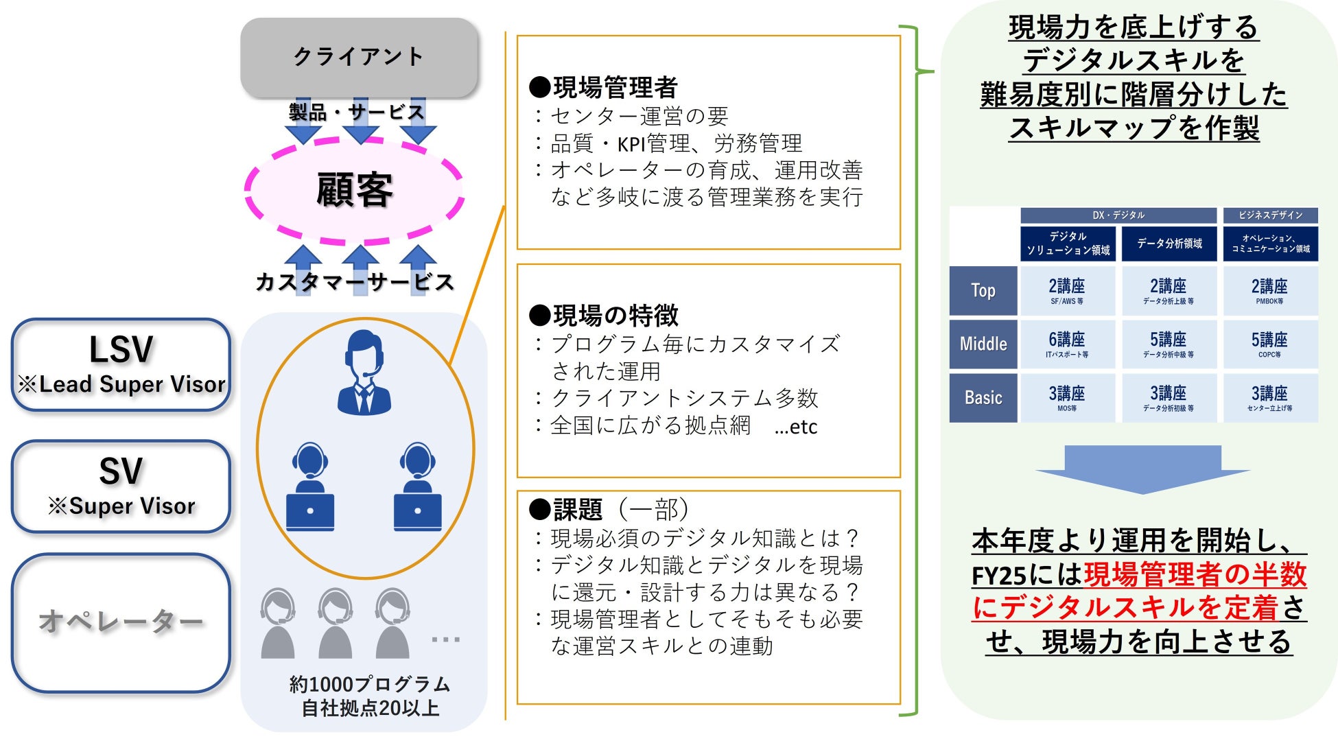 初年度となる今年は階層合計で60人を、3年後の2025年度には現場管理者の半数がデジタルスキルを習得し、センターが運営される状態を目指します。