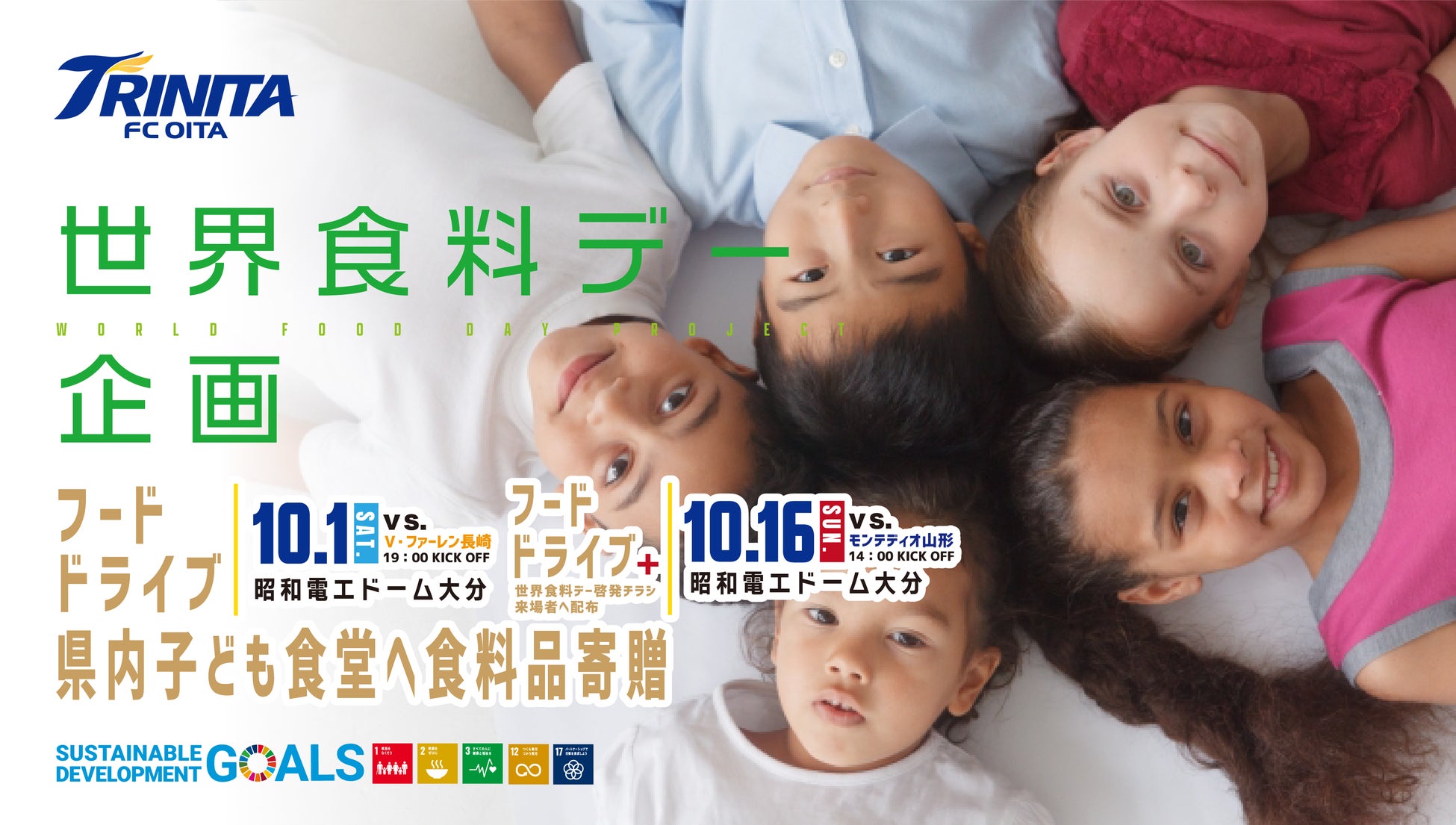 いただきものや、つい買いすぎてしまったものなど開封しないまま家庭に保管されている食品を一般の方から集め、フードバンクを通じて活用する活動です。当企画では、ホームゲーム開催日にサポーターの皆様よりフードドライブに参加いただき、サポーターの皆さまにいただいた食料品をフードバンクおおいた様へ寄贈。フードバンクおおいた様より県内の「食」を必要とする方々へ届けていただく予定です。