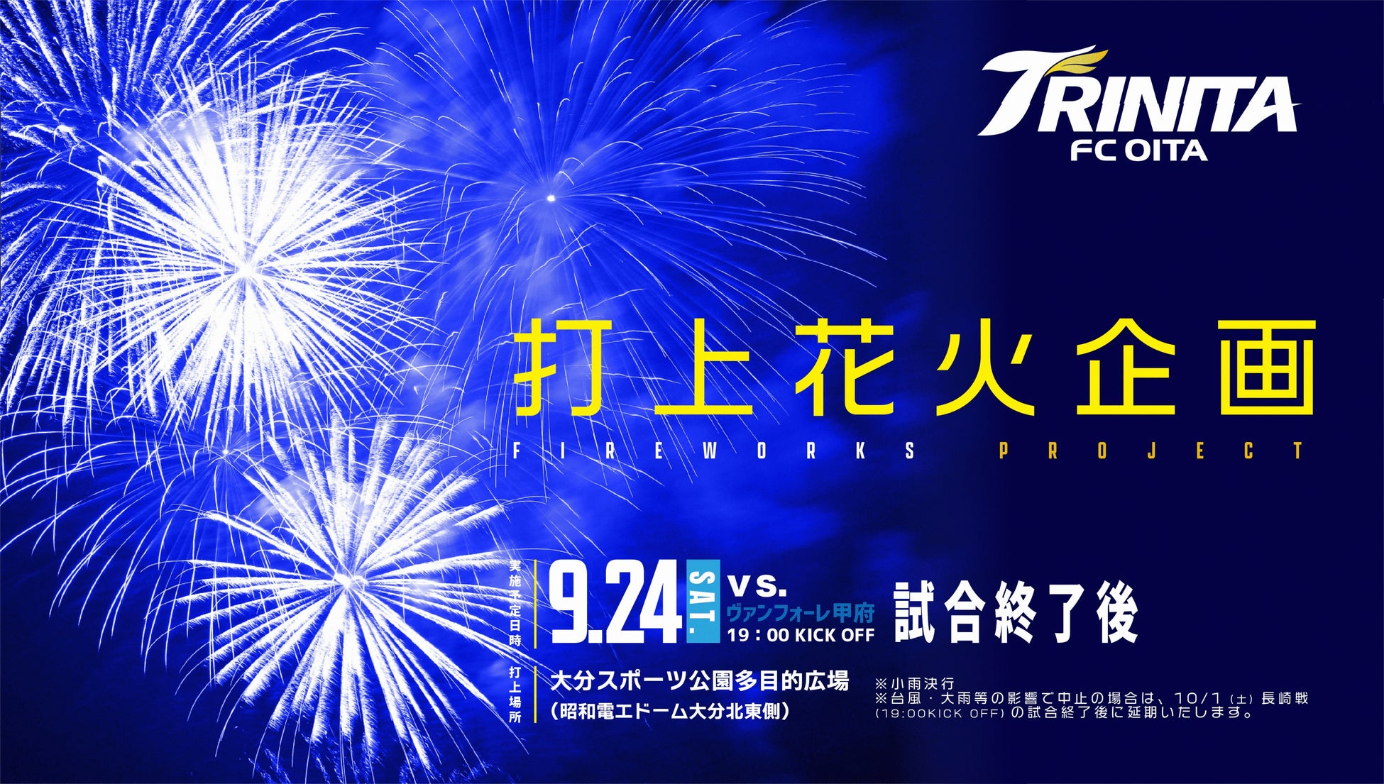 小雨決行:台風・大雨の影響で中止の場合は、10月1日(土)V・ファーレン長崎戦(19時試合開始)の試合終了後に延期いたします。