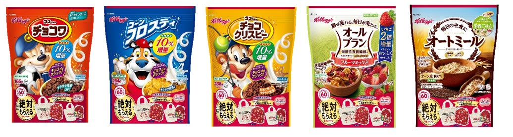 さらに、栄養バランス満点のキッズシリーズ3品や、健康志向の高まりで注目が高まっているオートミールやオールブラン フルーツミックスの計5製品において、期間限定で本キャンペーンの告知を入れたパッケージデザインを発売いたします。ぜひ、様々な製品をお楽しみいただく中で、本キャンペーンに応募して、トートバッグ&保温保冷巾着セットをゲットしてみてください。※一部を除く