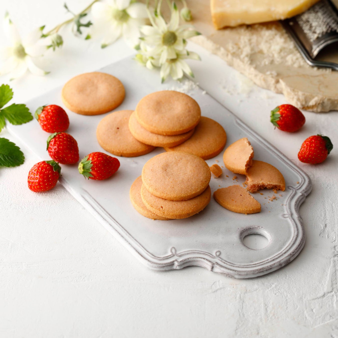 パルメザンチーズを使用しチーズのコクを引き出した生地に苺のペーストをあわせたこの時期限定の商品です。生地もほんのりピンク色に仕上げたクッキーは、サクサクとした食感と甘酸っぱい苺の香りがお楽しみいただけます。チーズのもつ塩味が苺の甘酸っぱさを引き立て、優しい味わいが楽しめる絶妙な組み合わせのクッキーは、お土産にはもちろん贈り物としてもぴったりな商品です。