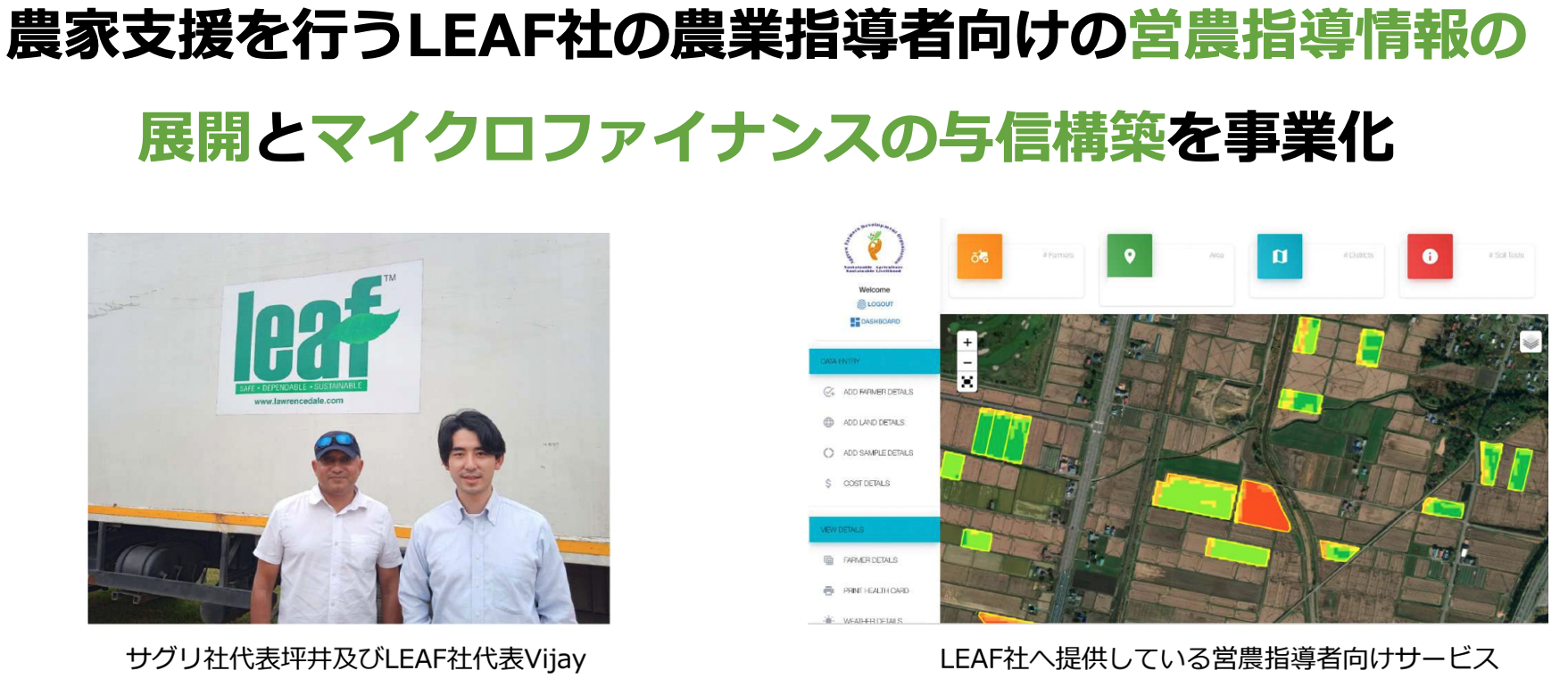 ローレンスデール・アグロ・プロセッシング・インディア(LEAF)は、タミルナド州に本社を構える小規模・零細農家の生活向上に取り組むインド随一の大手総合農業技術企業である。LEAF社が提供するデジタルプラットフォームは、高品質の農業資材提供、農学的な営農指導、市場との連携など、低所得農家が持続可能な農業を実現するためのコミュニティを構築している。また、テクノロジーを駆使した農作物物流システムも開発しており、サプライチェーンの無駄を省くことで、農家の利益に寄与する仕組みを提供している。