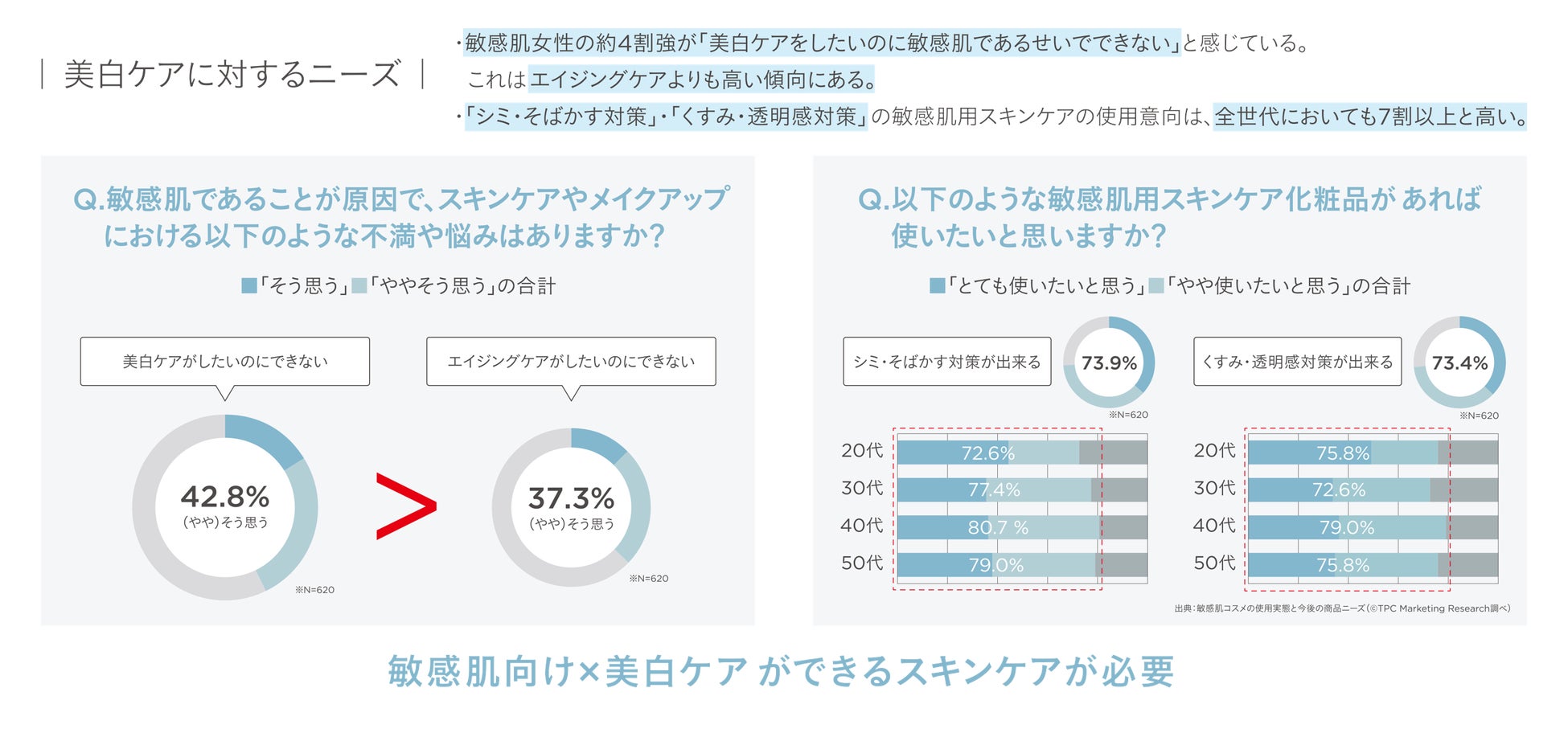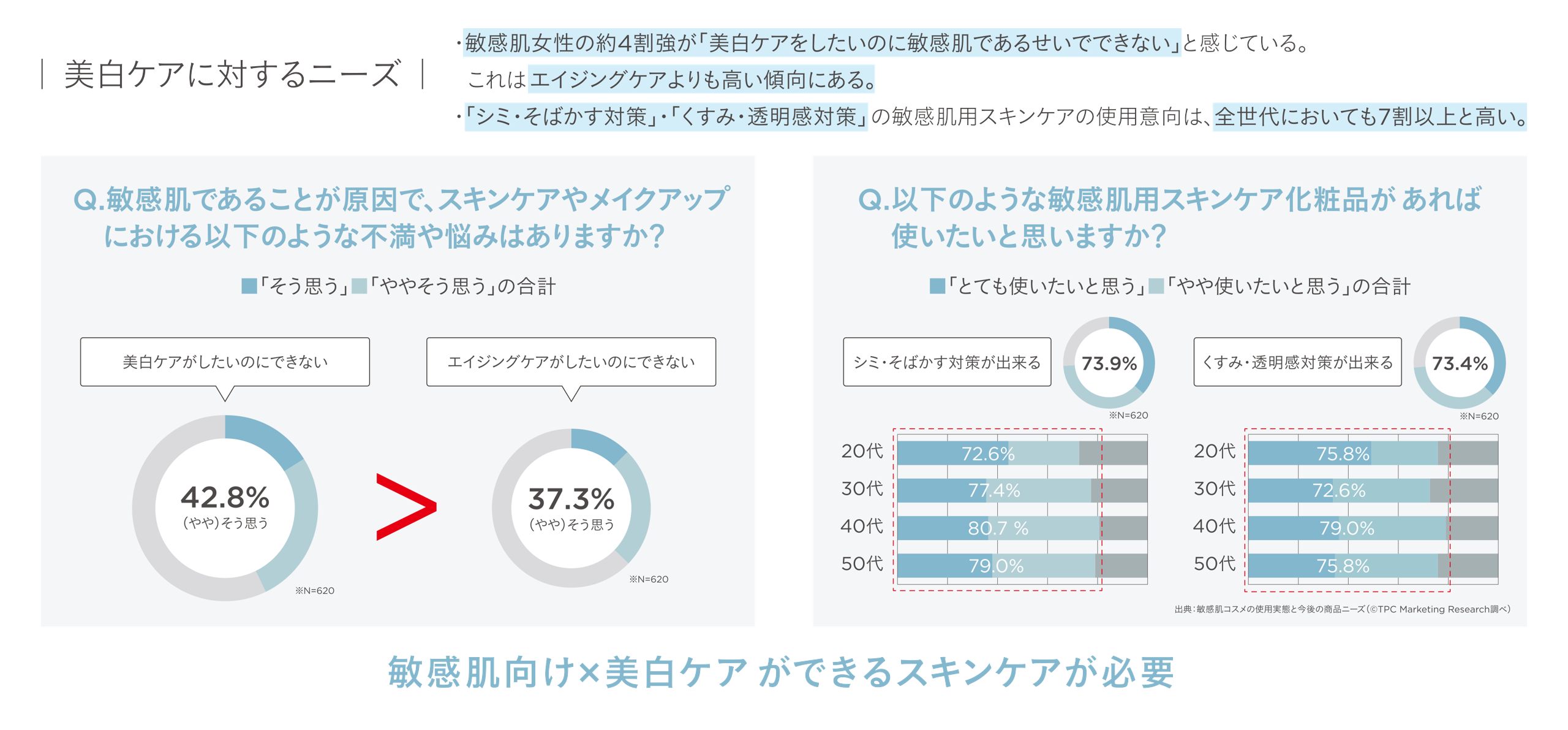 敏感肌女性の約4割強が「美白ケアをしたいのに敏感肌であるせいでできない」と感じており、エイジングケアのそれより高い傾向にある。