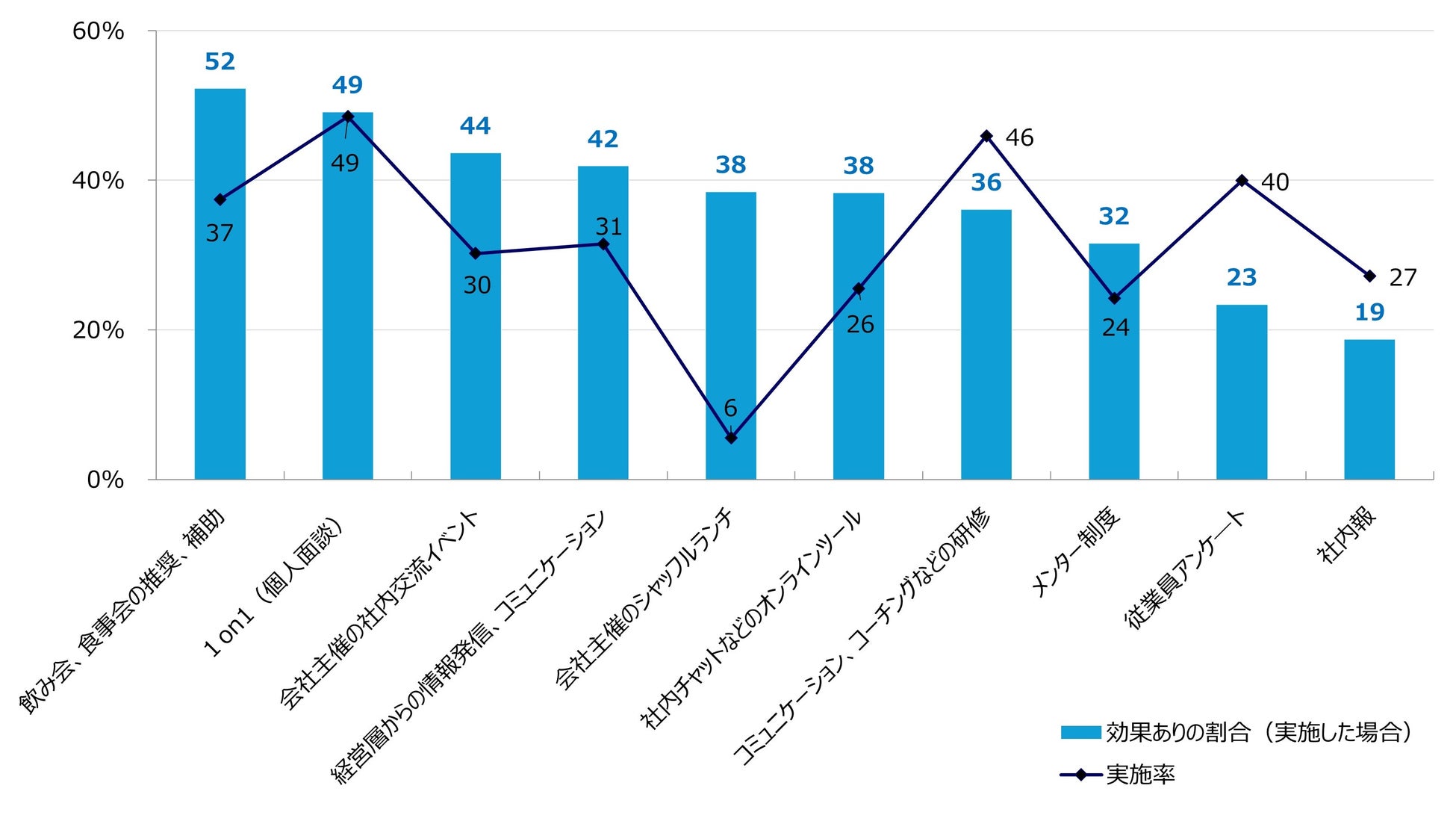 ・しかし効果が高いと感じられているのは「飲み会、食事会の推奨・補助」(52%)や「会社主催の社内交流イベント」(44%)などのアンオフィシャル施策が上位に挙がる(図表4)。