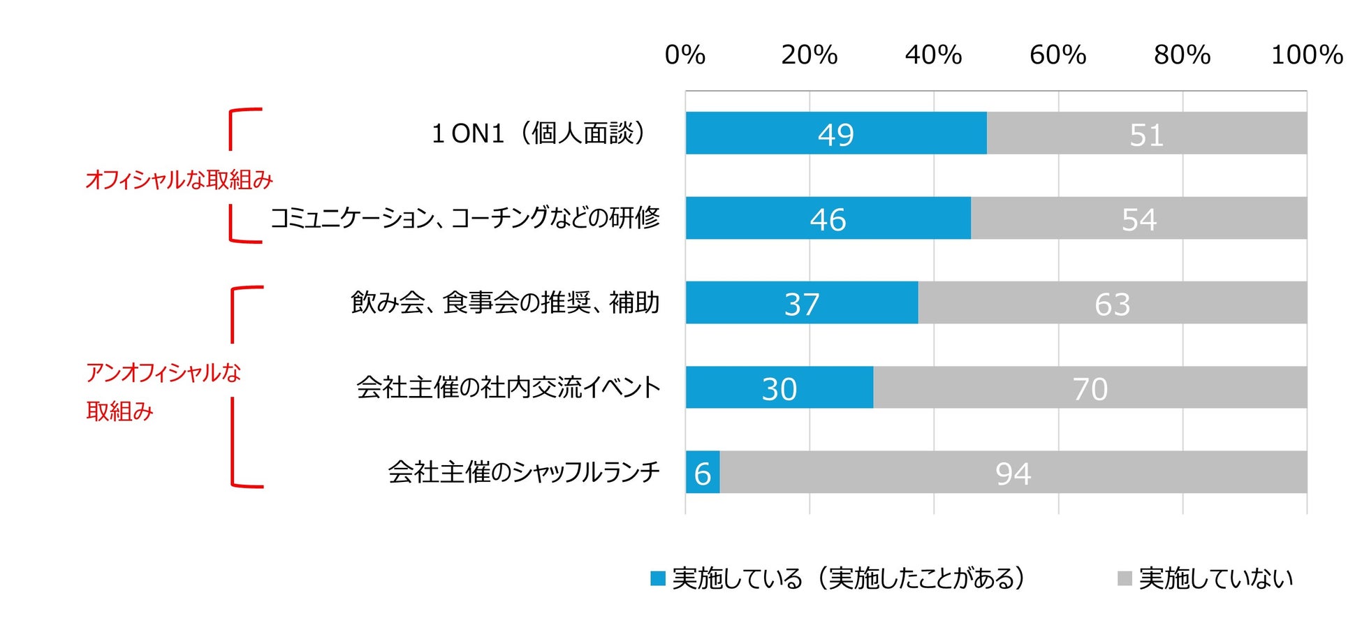・実施率が高いのは「1on1」(49%)や「コミュニケーション研修」(46%)などのオフィシャル施策(図表3)。